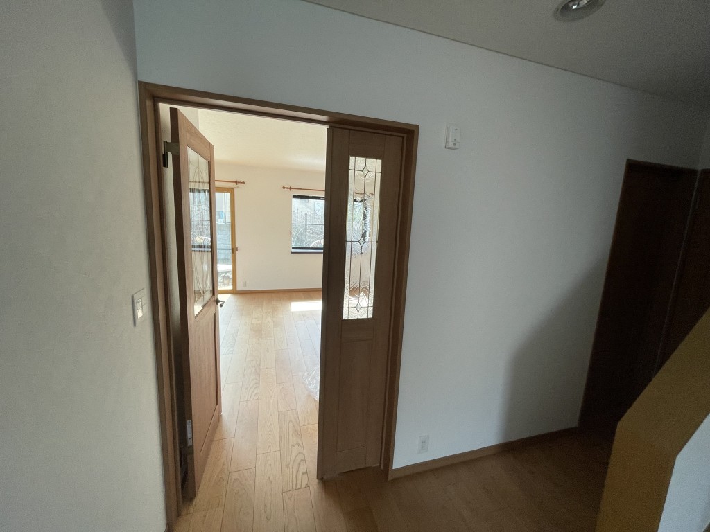 玄関ホールからリビングに入るドアもおしゃれな親子ドアに交換しています。