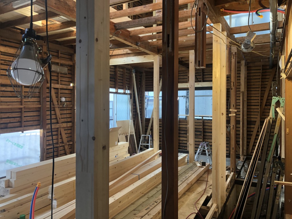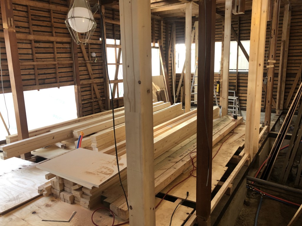 現場には新しい柱や梁、筋交いが搬入され「耐震補強設計図書」に基づく耐震補強工事が行われています。
