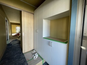 玄関収納は、しっくいホワイト・建具はメープルを選びました