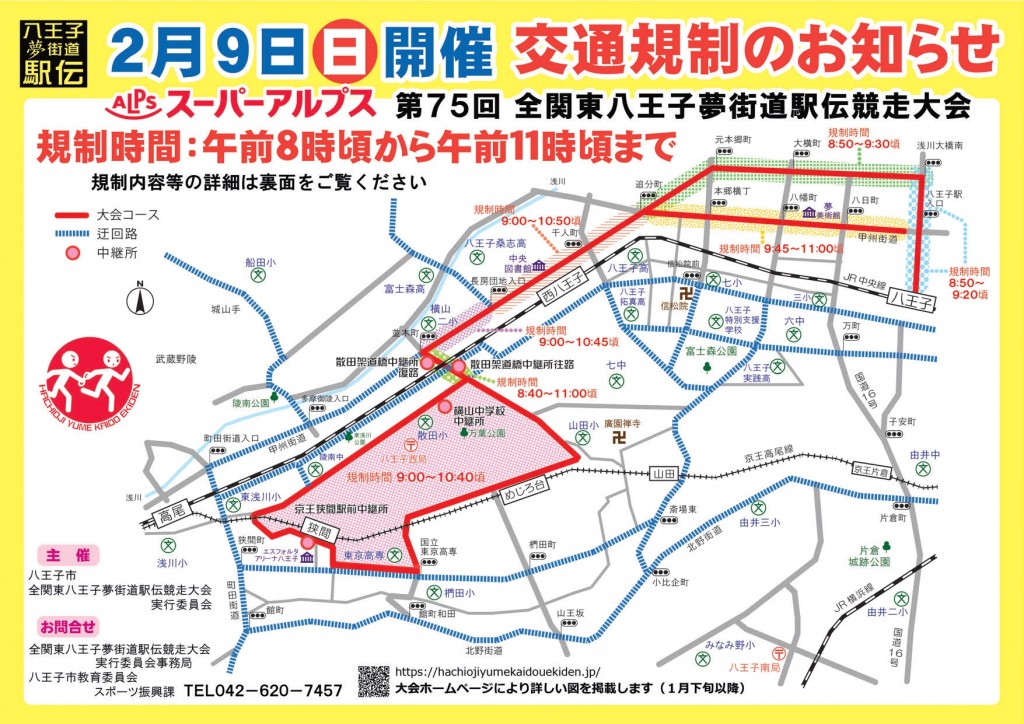 駅伝当日はエンラージ八王子店前の甲州街道が午前11時頃まで通行止めになりますので、