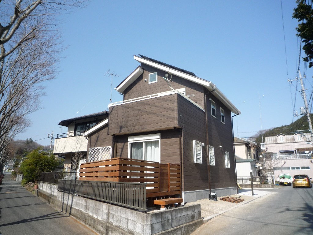 南側ウッドデッキにはすべて無垢の「ウリン」を使用しました。別名「アイアンウッド」と言われ、堅く丈夫で腐りにくい木材です。北側は駐車スペースのコンクリート舗装をして、キャンピングカーが停められるハイルーフのカーポートを設置しました。