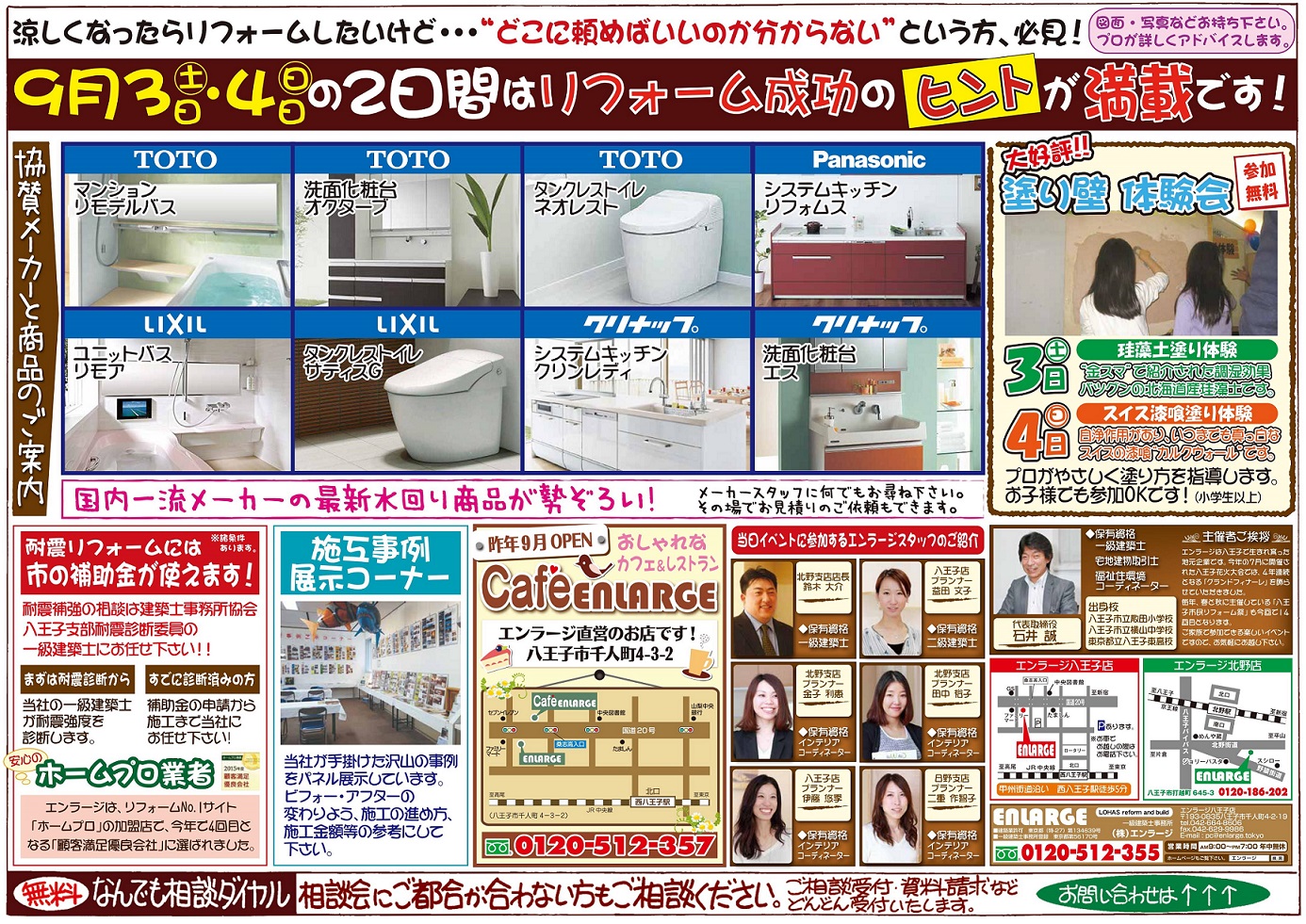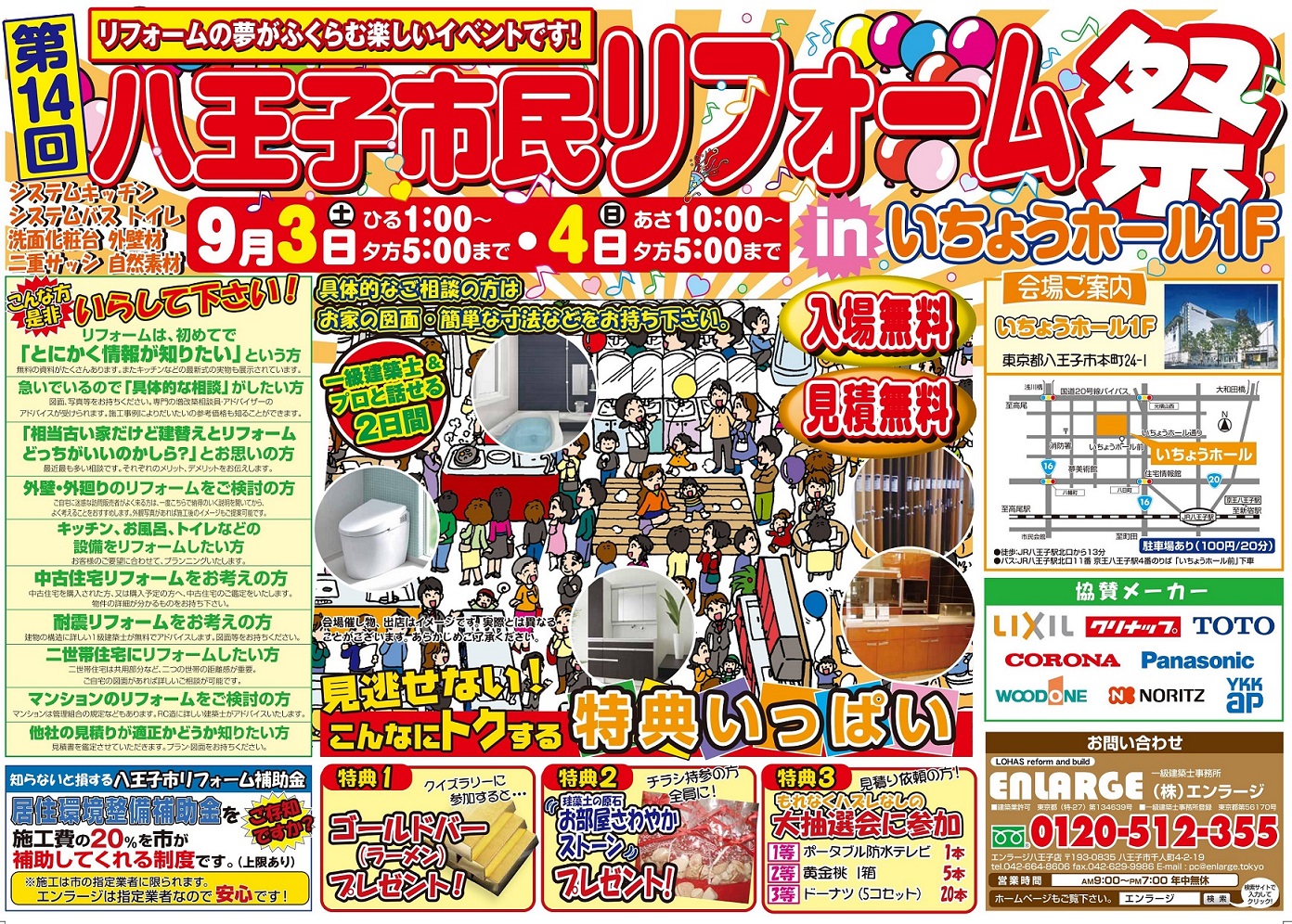 エンラージ主催の「第14回八王子市民リフォーム祭」が9月3日(土)と4日(日)の2日間、八王子いちょうホールにて開催されます。協賛メーカーはTOTO・リクシル・パナソニック・クリナップで、キッチン・ユニットバス・洗面台・トイレ等の展示が多数あり、メーカーさんから直接商品の説明が聞けます。リフォーム相談コーナーでは一級建築士やインテリアコーディネーターに無料で何でも相談できます。お客様の夢の実現に向けてプロならではのアドバイスや数々のビフォーアフターのように生まれ変わった施工事例をご紹介いたします。大人気の珪藻土塗り体験や豪華景品が当たる『大抽選会』等もご用意しております。ご来場特典は、もれなく全員に「珪藻土の消臭剤」をプレゼントさせて頂きます!