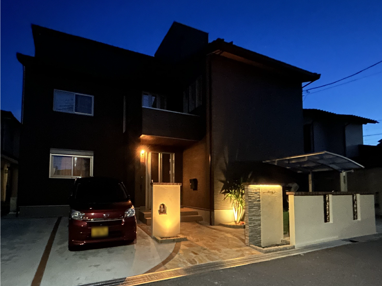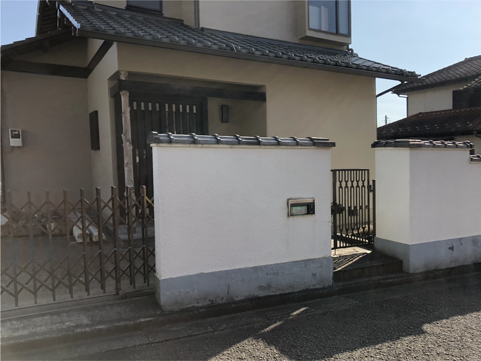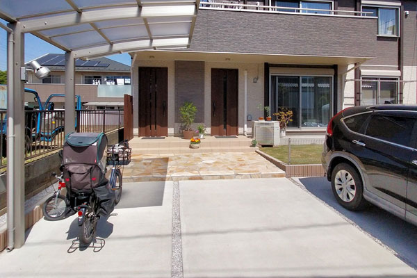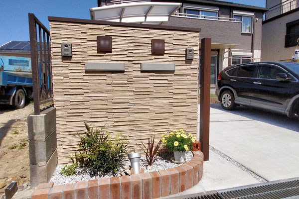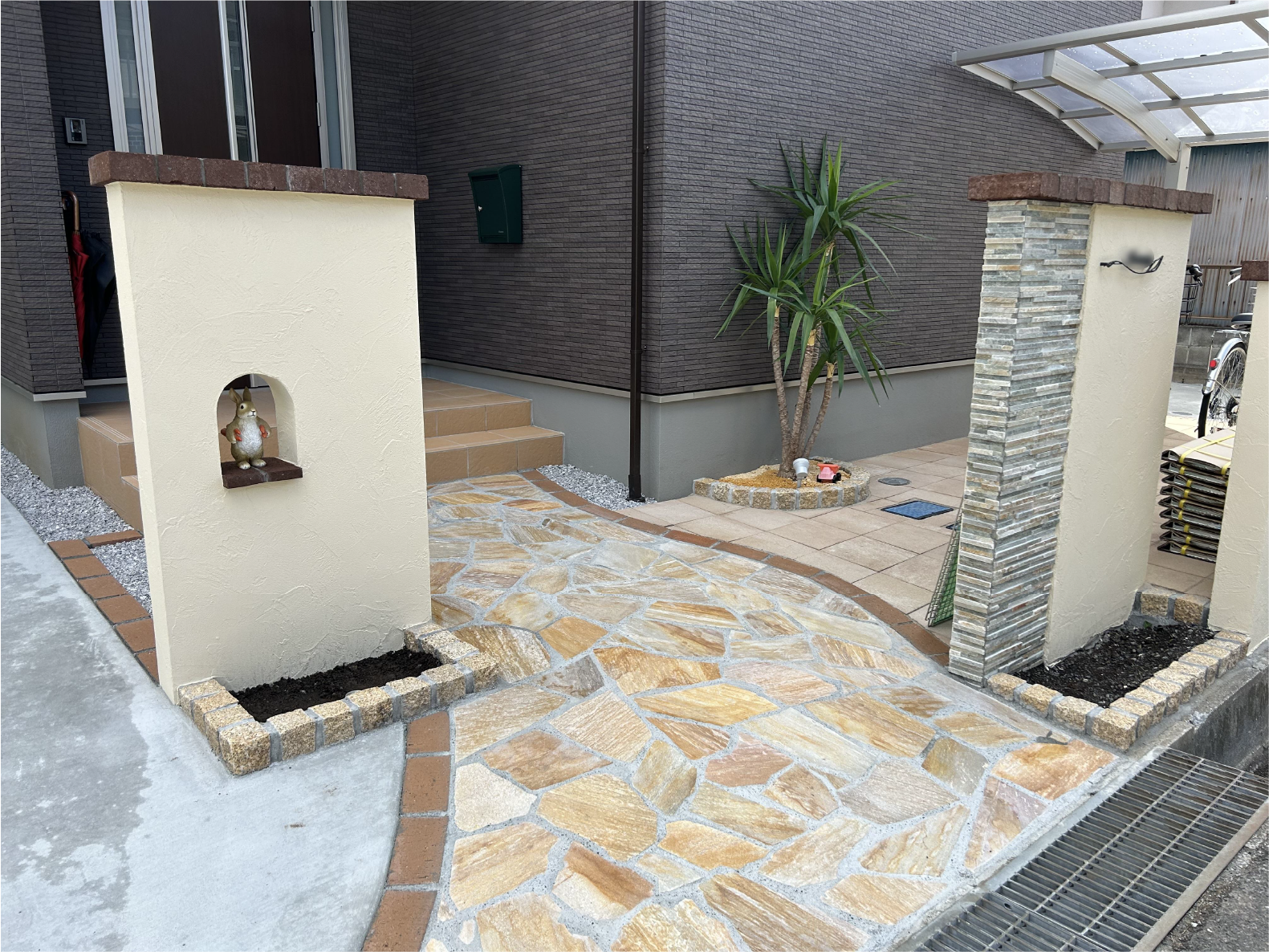 ハウスメーカーで建てたお家の新築外構。玄関前に配置した花壇付きのデザインウォールはお気に入りの置物をおくためにオリジナルのサイズで開口。うさぎちゃんがとてもキュートです。門塀には「ディバネート」を塗り、アクセントで鋳物アイアンのフェンスを採用しています。シンボルツリーやサイクルポートも新設し、建物の周囲には防草シートと砂利を敷いてメンテナンス性を向上。アプローチは照明の設置などにもこだわっていて、夜の帰宅をやさしく迎えてくれる温かみのある表情もポイント。