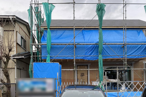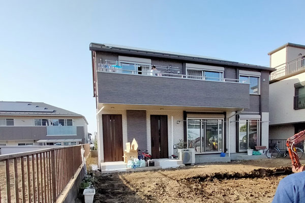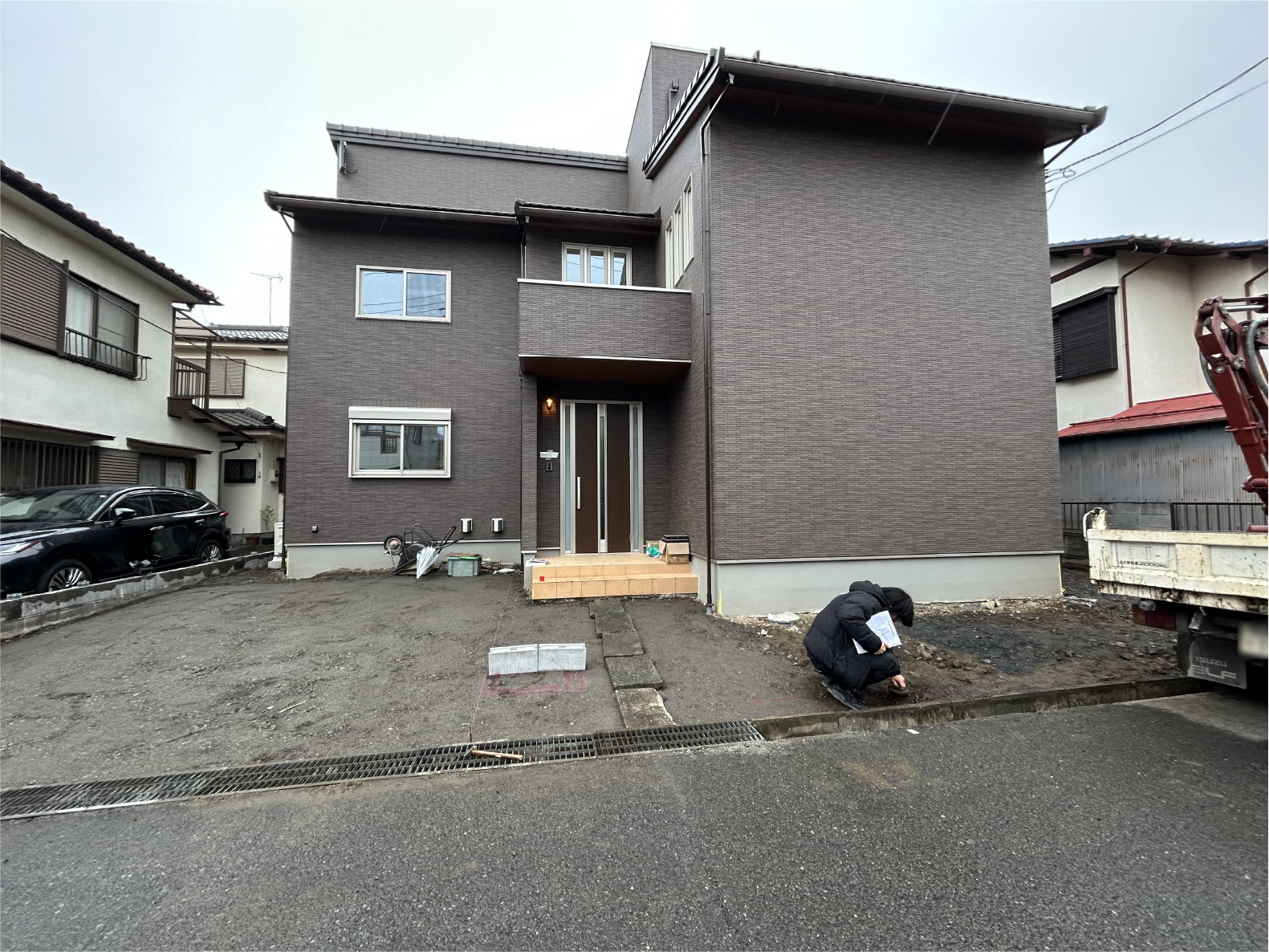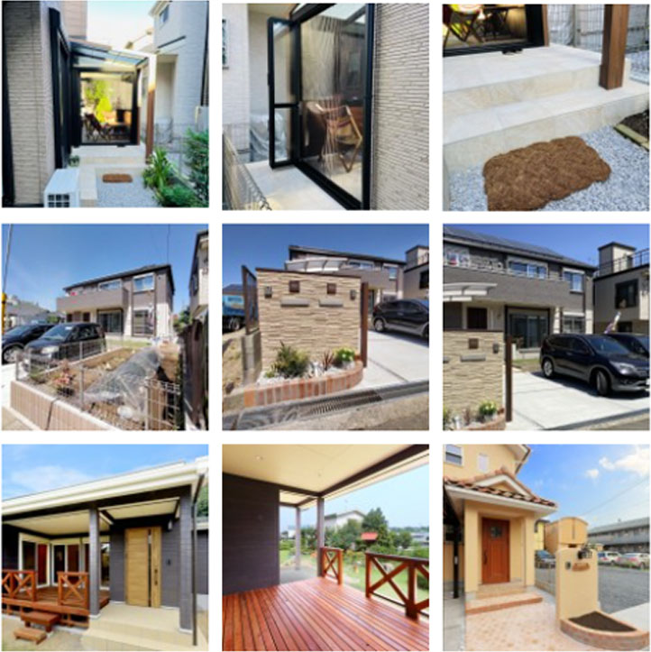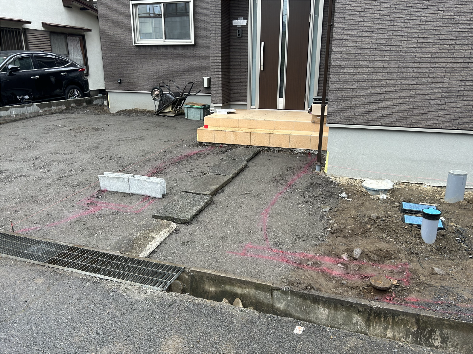 ハウスメーカーで建てたお家の新築外構。玄関前に配置した花壇付きのデザインウォールはお気に入りの置物をおくためにオリジナルのサイズで開口。うさぎちゃんがとてもキュートです。門塀には「ディバネート」を塗り、アクセントで鋳物アイアンのフェンスを採用しています。シンボルツリーやサイクルポートも新設し、建物の周囲には防草シートと砂利を敷いてメンテナンス性を向上。アプローチは照明の設置などにもこだわっていて、夜の帰宅をやさしく迎えてくれる温かみのある表情もポイント。