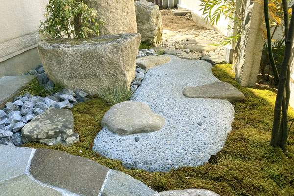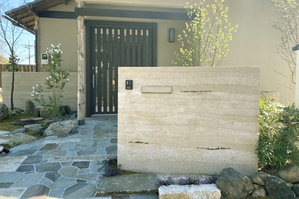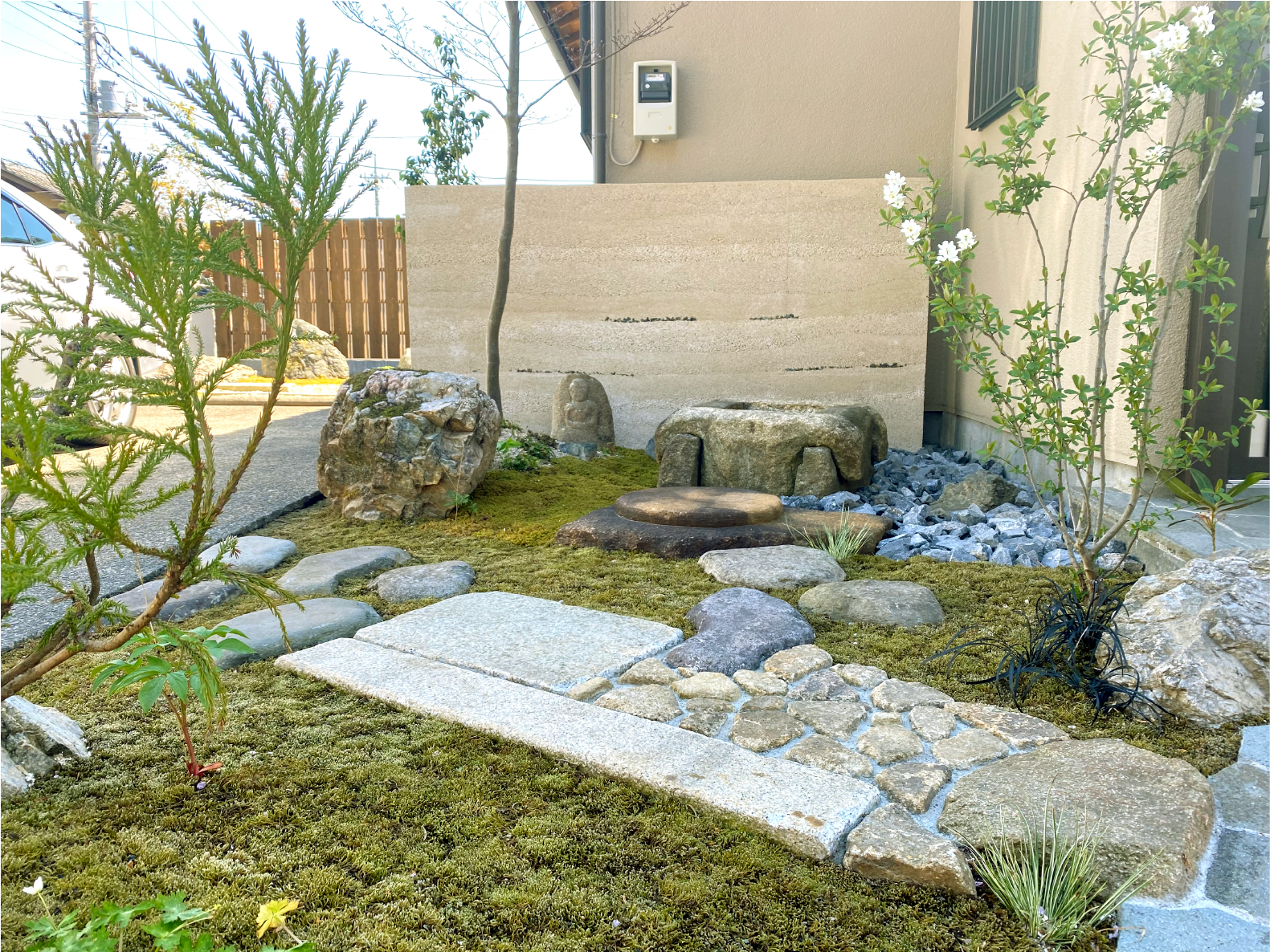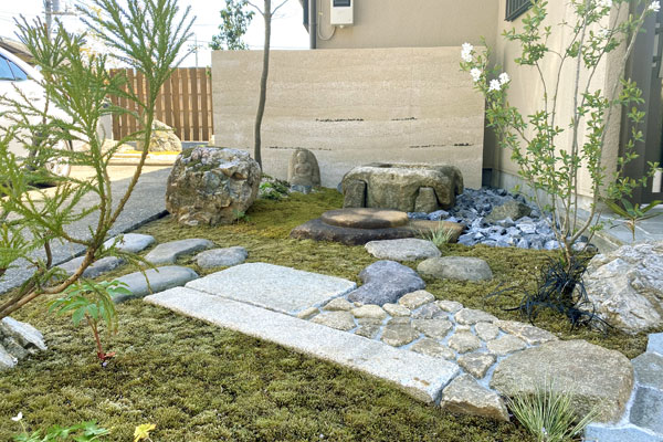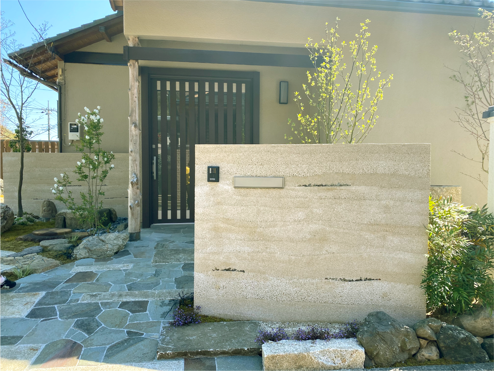 以前のお住まいで大切にされていた思い入れのある庭石をすべて運び入れて移築した和風庭園が完成。庭石それぞれの特徴をいかしながら1つずつ丁寧に配置してまわりに苔を敷き込むことで、石のもつ魅力を引き立てています。門塀には幾重にも重なる地層のような模様が美しい版築土塀を採用。伝統的な技法でつくった土塀は歴史を感じるような重厚感のある仕上がりで、和の趣をさらに印象深く演出しています。新しい暮らしにホッと落ち着ける時間と安らぎを与えてくれる素敵なお庭になりました。