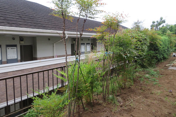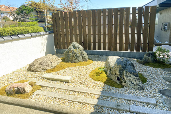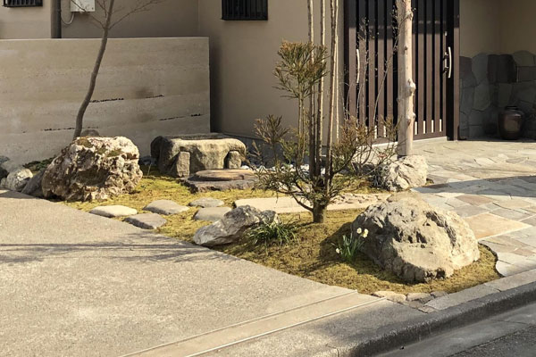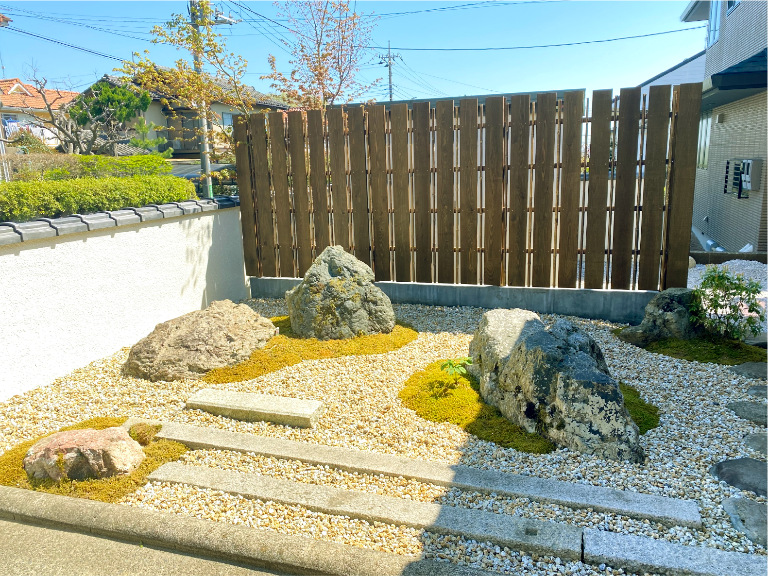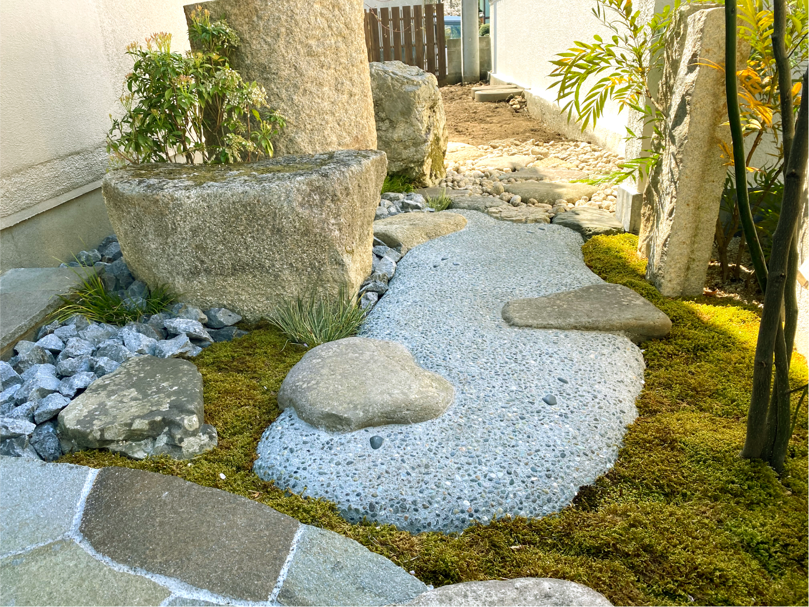 以前のお住まいで大切にされていた思い入れのある庭石をすべて運び入れて移築した和風庭園が完成。庭石それぞれの特徴をいかしながら1つずつ丁寧に配置してまわりに苔を敷き込むことで、石のもつ魅力を引き立てています。門塀には幾重にも重なる地層のような模様が美しい版築土塀を採用。伝統的な技法でつくった土塀は歴史を感じるような重厚感のある仕上がりで、和の趣をさらに印象深く演出しています。新しい暮らしにホッと落ち着ける時間と安らぎを与えてくれる素敵なお庭になりました。