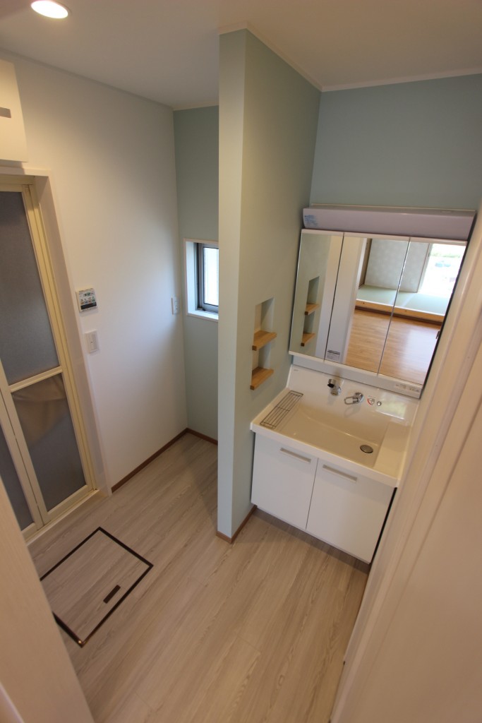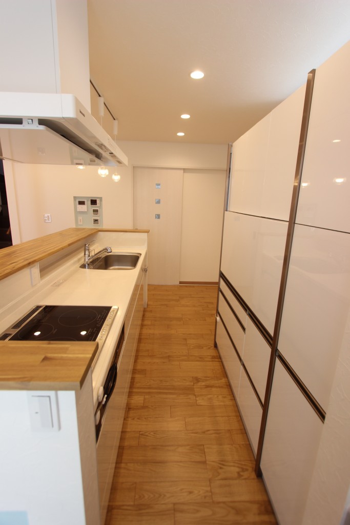 キッチンは、立ち上がりの壁をコの字に造作してアイランド型に配置。浴室・洗面・トイレは既存の器具を綺麗にして再利用し、壁紙を好みのデザインに貼り替えました。