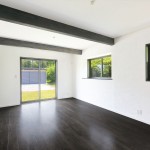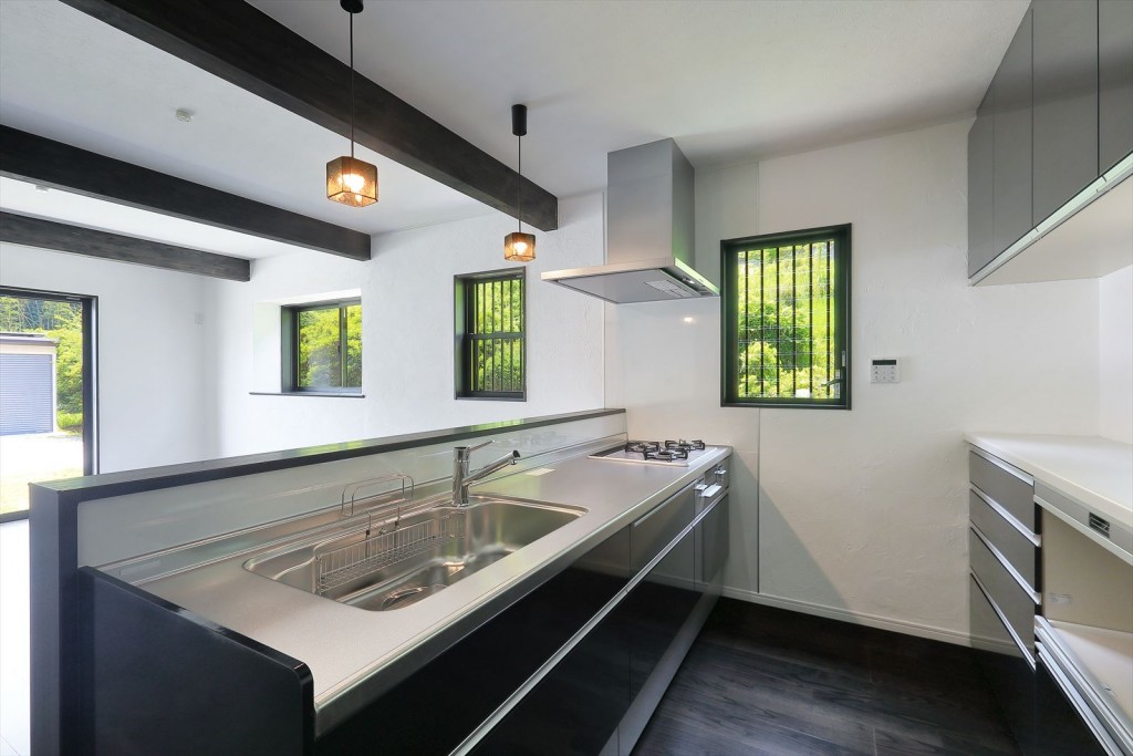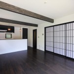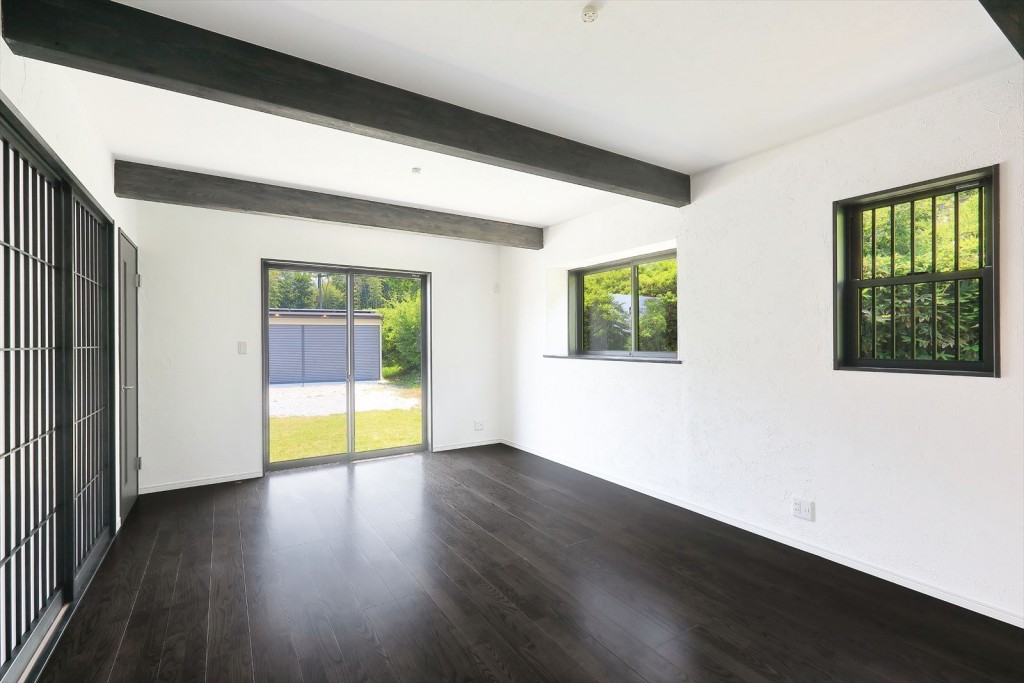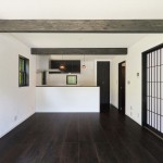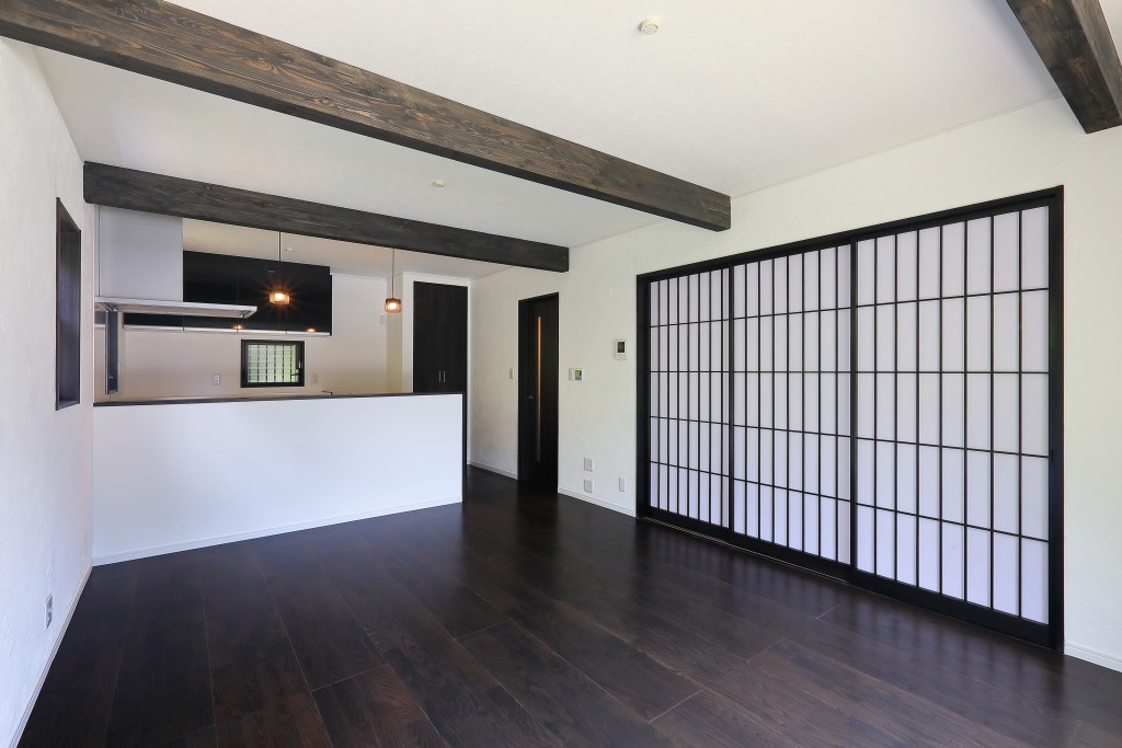 LDKの天井には梁を露出させて「和」のアクセントをつけました。梁も内装に合わせて塗装しています。壁にはスイス漆喰を採用し、重厚感のある床材とのコントラストがきれいに仕上がっています。