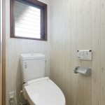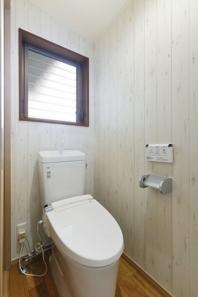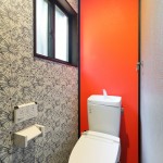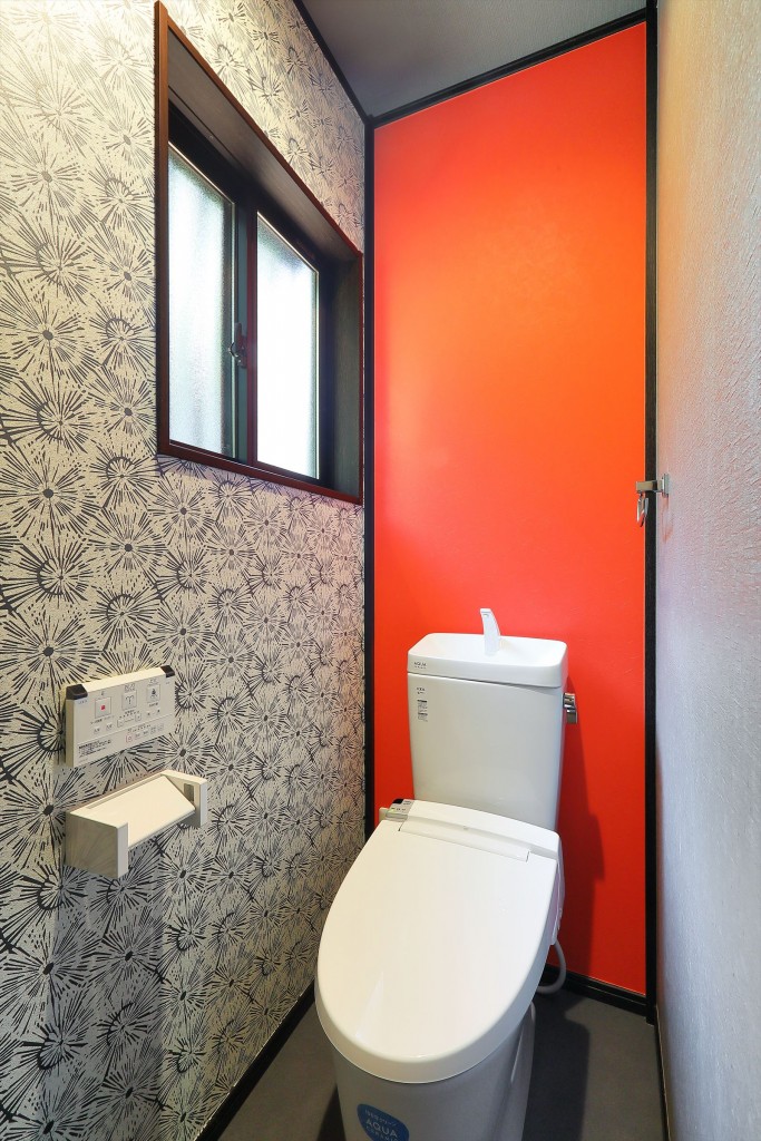 マンダリンレッドのアクセントクロスが映える1階のレストルーム。ご主人様のこだわりとコーディネーターのセンスがつまった空間に生まれ変わりました。2階は、奥様の好みの内装で仕上げ、1階と2階のトイレをそれぞれのこだわりの空間に。