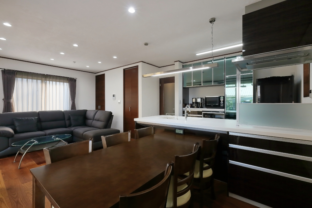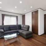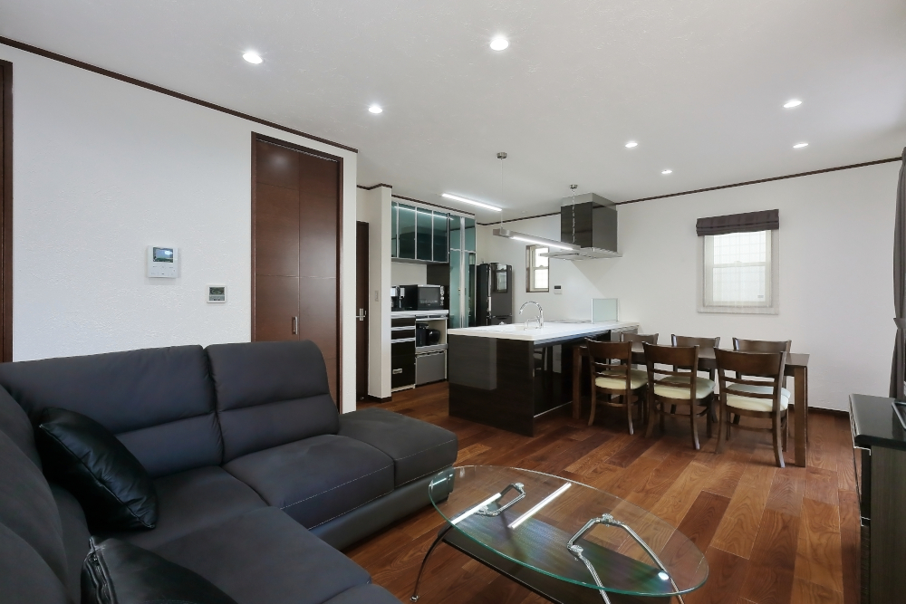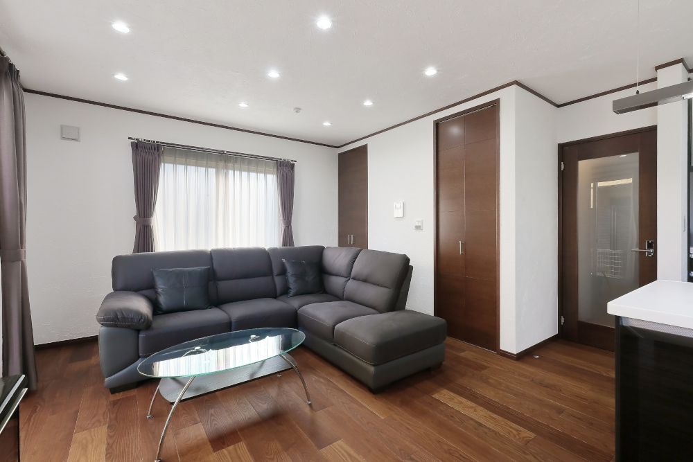 可愛らしい外観とは打って変わって、LDKは高級感漂う大人の雰囲気です。ダンディなI様らしい内装になりました。床はアッシュ(タモ)の無垢フローリングで床暖房に対応しています。内装はスイス漆喰で仕上げています。