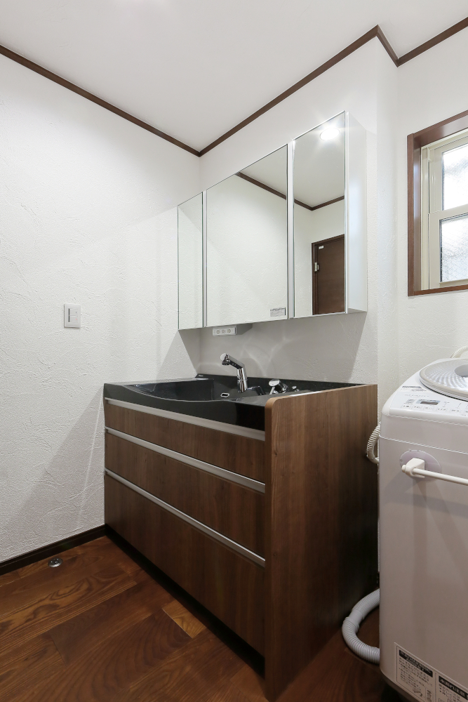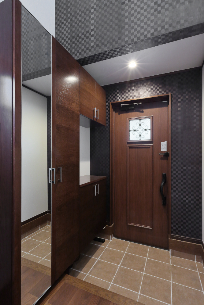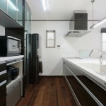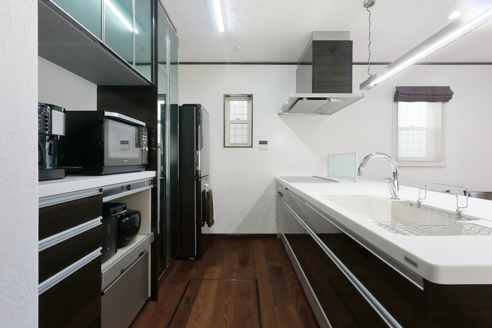 元料理人の本格派のお客様だったので、キッチンはクリナップの『クリンレディ』をご提案しました。ハーフミラーのカップボードは『SS』を組み合せています。上質感と洗練されたデザインはまるでショールームにいるようです。