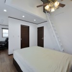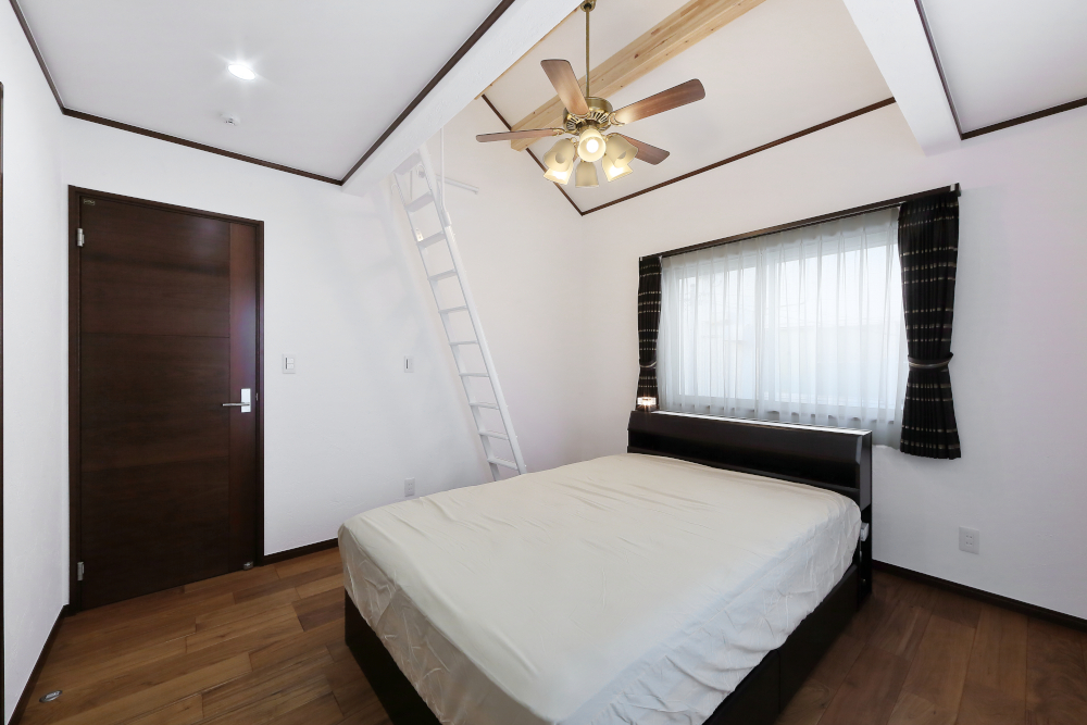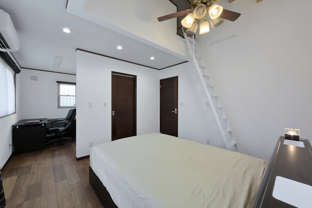 開放的な吹抜けがある寝室。奥には3帖の書斎と3帖のウォークインクローゼットが隣接しています。寝室の上部に約4帖のロフトスペースを設けました。高さは1.4m以内に制限されますが、+αの空間として有効に活用できます。
