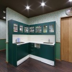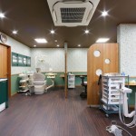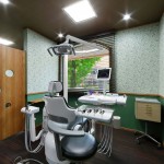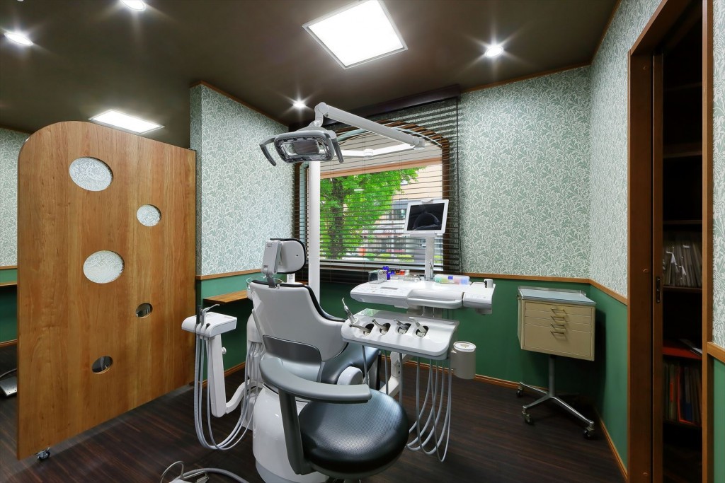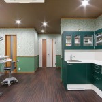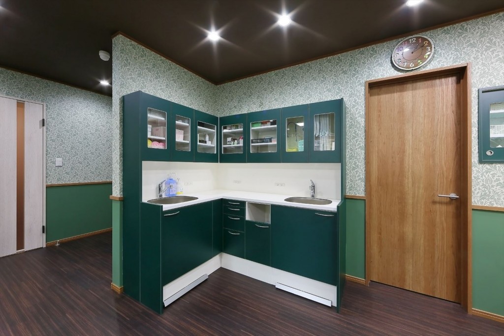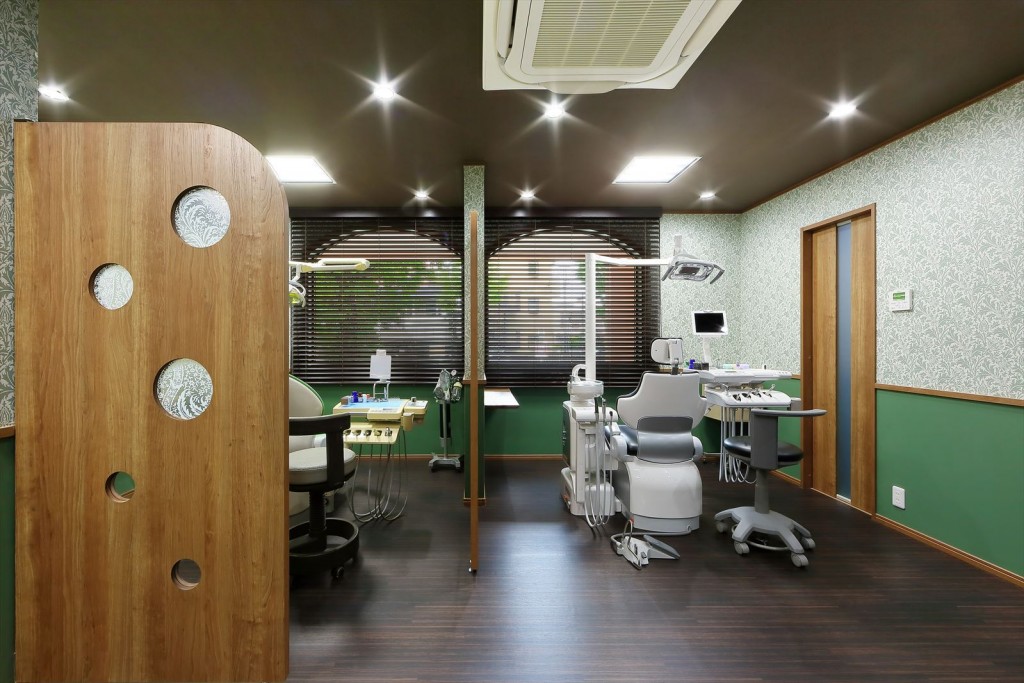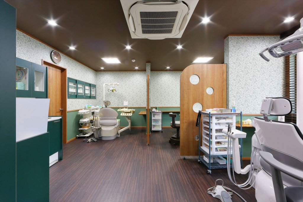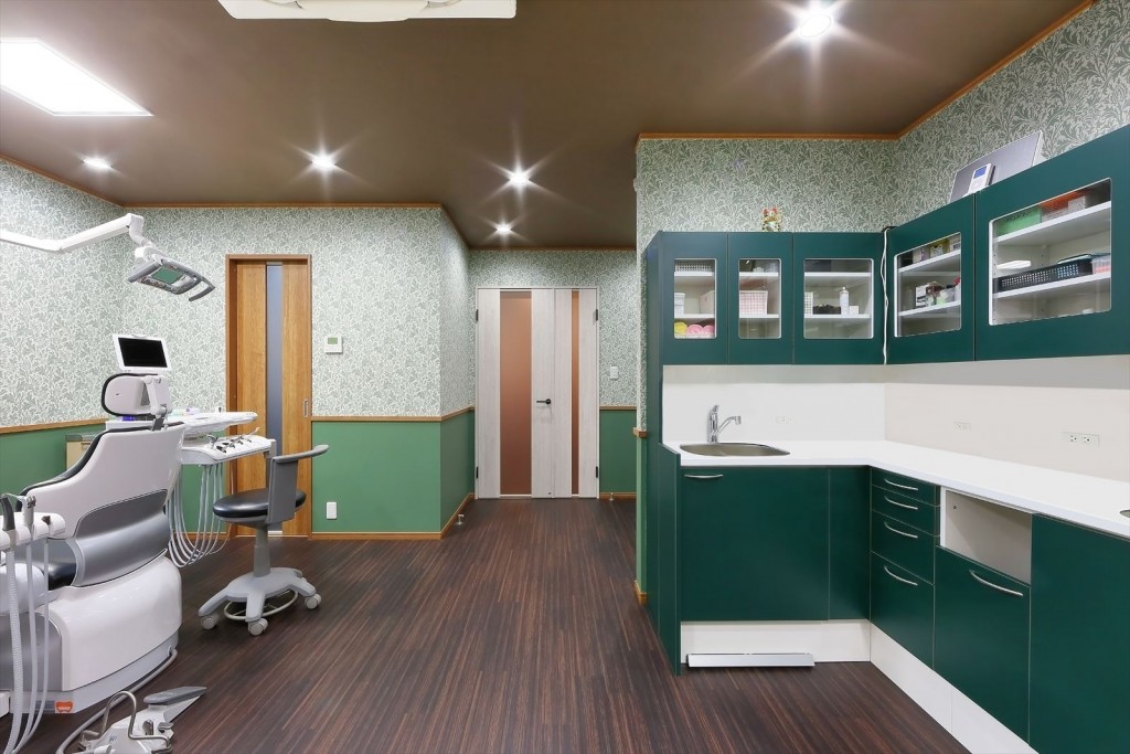 診療室はグリーンのアクセントを効かせ、ブラウン系の床材と合わせました。