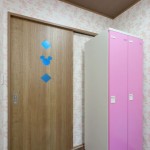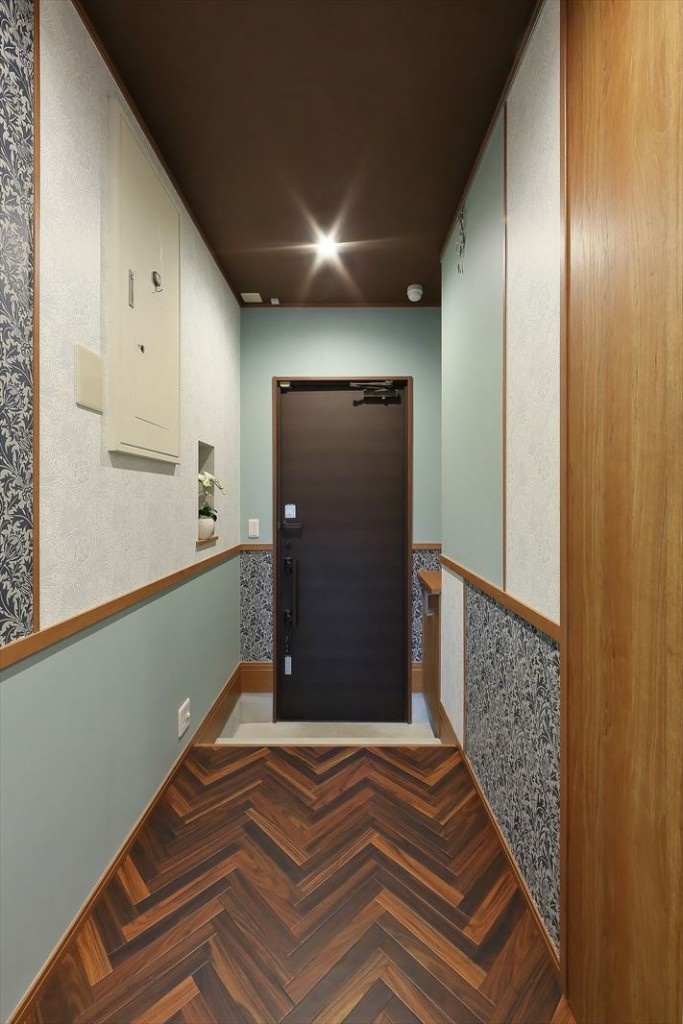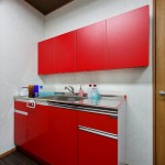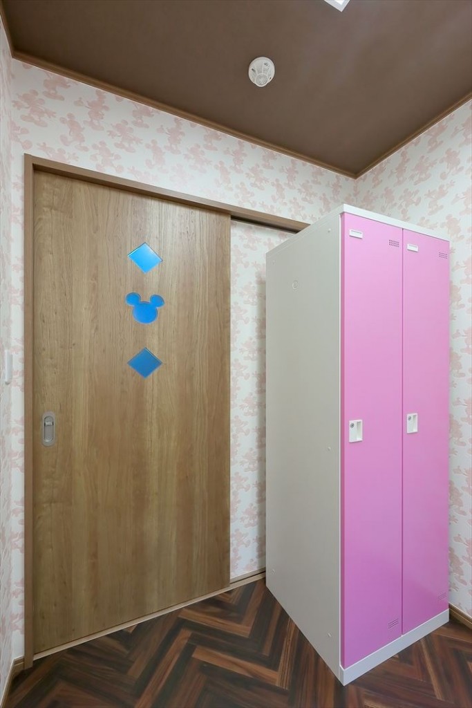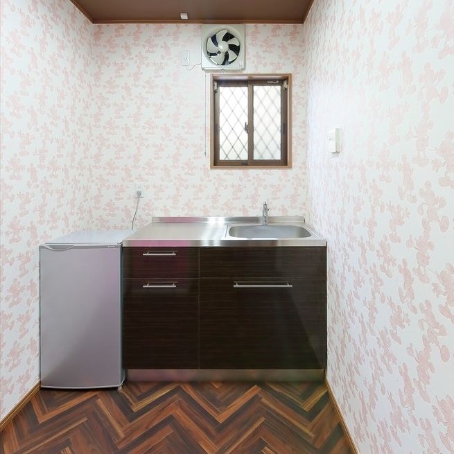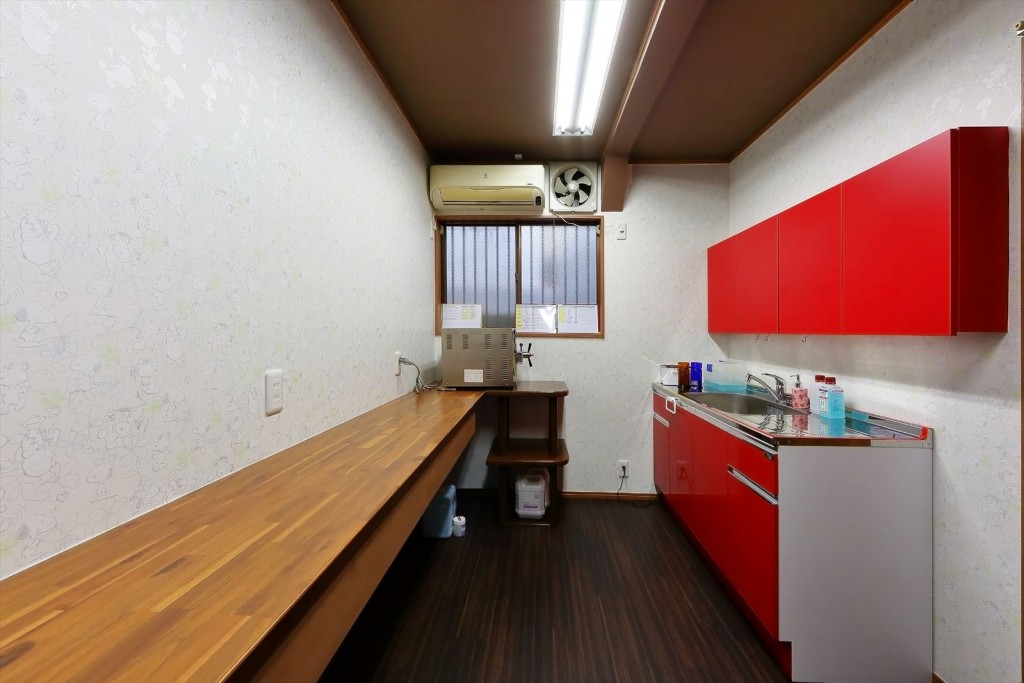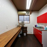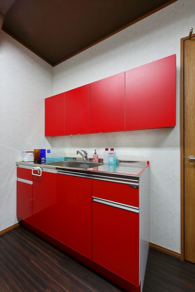 床は無垢のウォールナット、壁はウイリアムモリスの輸入クロスです。先生方やスタッフさんのくつろぎのスペースになりました。スタッフさんの給湯室も新設しました。流し台は「サンワカンパニー」のおしゃれなミニキッチンです。