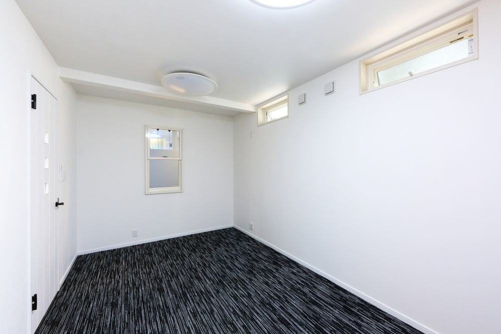 書斎の隣はご夫婦の寝室になっています。ダウンライトと間接照明を巧みに組み合わせ、ホテルのように居心地の良い空間になりました。床はカーペットを敷いて、壁はスイス漆喰で仕上げています。