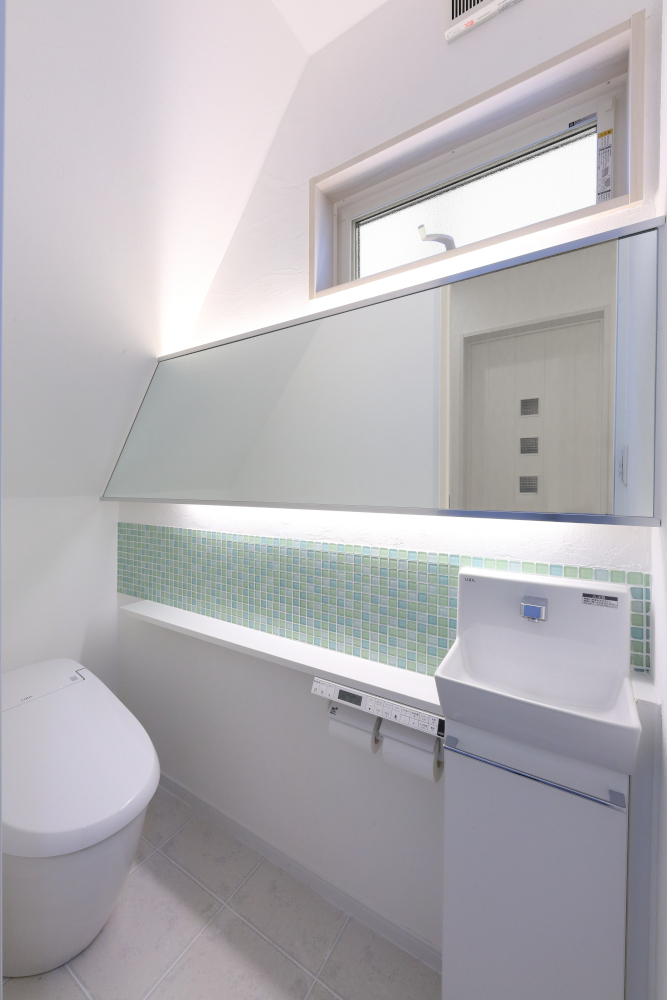ご自宅で仕事をすることが多いK様の書斎。PCやプリンターなどOA機器の配線は壁の収納ボックスへしまうことができ見た目もスッキリ!書斎の一角には、おしゃれな造作洗面を手作りし、カウンター下には暖炉スペースを作りました。