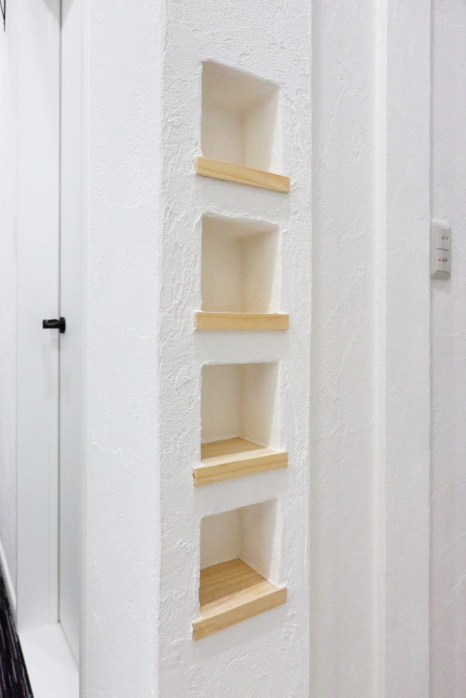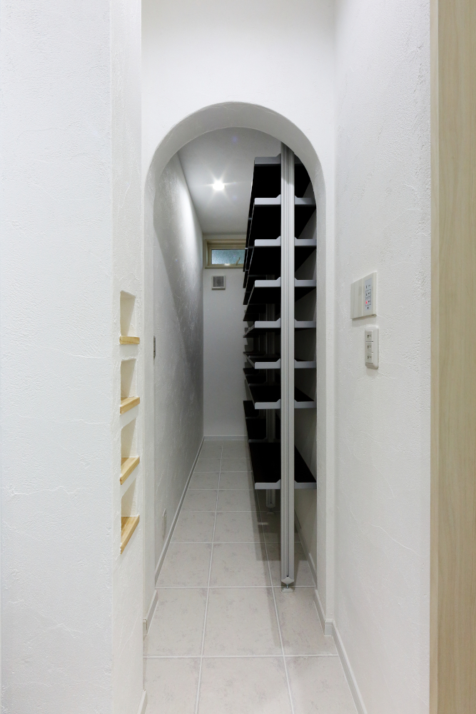 たくさんの、素敵な靴をお持ちのK様。スペースを有効に活用した念願のシューズインクローゼットが完成しました。玄関から靴を履いたまま入れる設計で、入口付近には家族4人分の鍵置き用のニッチを造作しました。