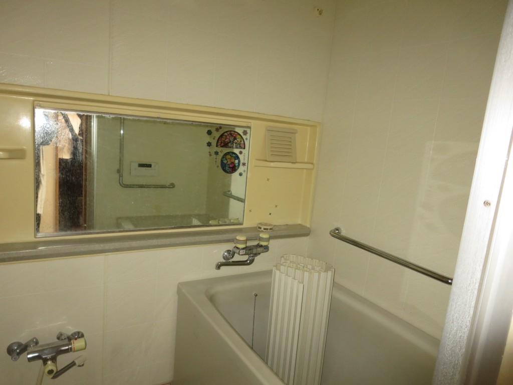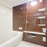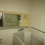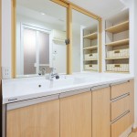 浴室と洗面台を北側の洋室があった場所に移設。洗面台はパナソニックの「シーライン」を加工して造作洗面風に。洗面台正面のミラーは内窓(二重サッシ)をミラーサッシに加工したもので、もちろん開閉も可能。浴室は1216サイズから、TOTOマンションリモデルバス1418サイズにサイズアップ。