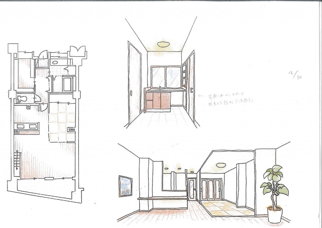 K様はホームページを見て、ご夫婦で八王子店にご来店くださいました。「中古マンションを購入したので、スケルトンにして全面的にリノベーションしたい」とご希望で、すでにご自分で書かれたリフォームブラン図をご用意され、「このプランを実現できそうな会社を探していたら、エンラージさんのHPが見つかった」と特命でのご依頼でした。実はK様は一級建築士で、ご自分で作成したプランの難易度も良くご存知の上でした。そのプランをベースに当社の一級建築士やプランナーとお打合せを重ね、リフォーム前とは大きく異なるオリジナルの居住空間が実現。ご夫婦とお子様が大満足のマンションフルリノベーションです。