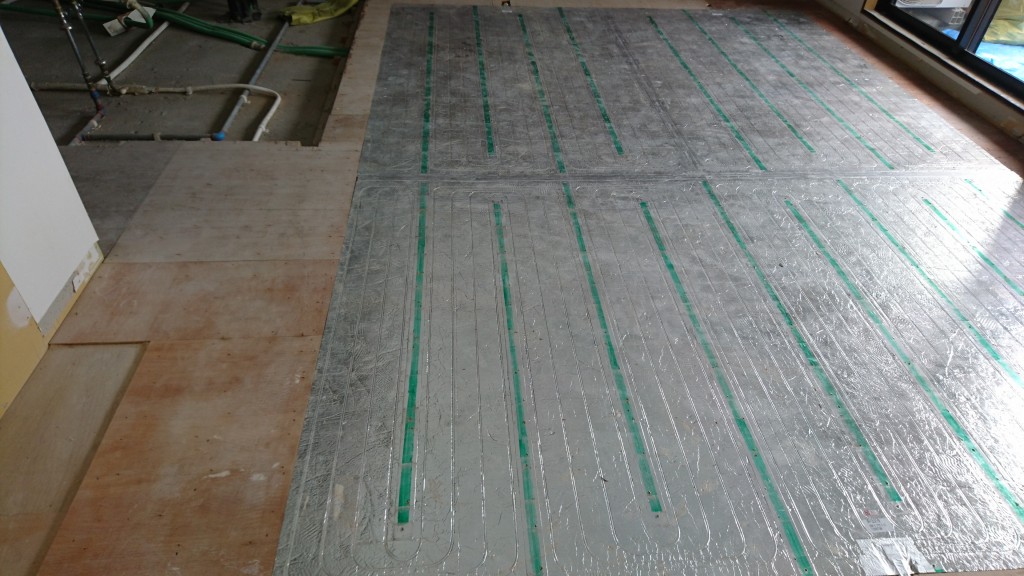 リビングの床にはTESの床暖房が設置されていましたが、古いフローリングを丁寧に剥がし床暖房を再利用。当社ではスタンダードな施工方法です。