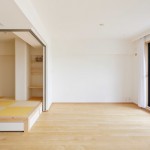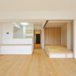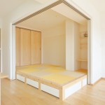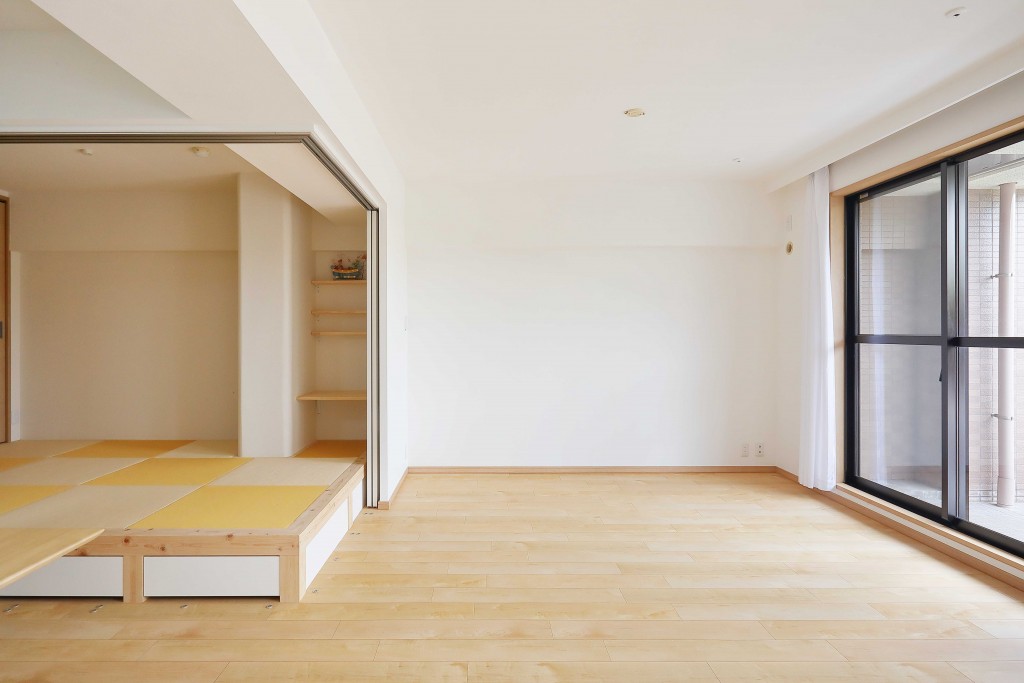 リビングの一角には約6帖の小上がり畳コーナーを新設。畳の下は引き出し式の収納になっています。L字型の間仕切り開閉壁で仕切ると、夜は寝室としても利用可能。