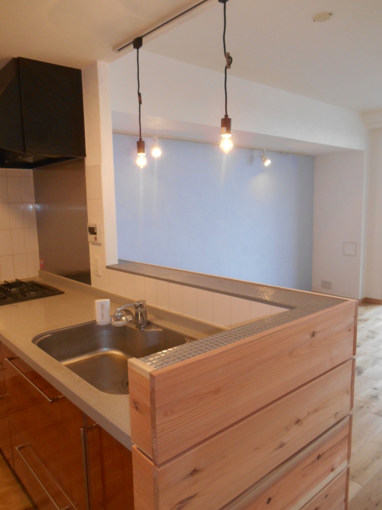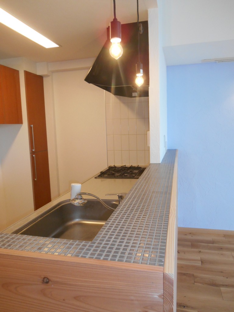 キッチンは吊戸棚をなくして、すっきりと開放的にしました。羽目板には、木目がきれいな杉材を採用しました。キッチンの笠木はカウンターの代わりにモザイクタイルを貼ってお洒落に演出。