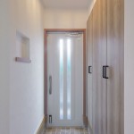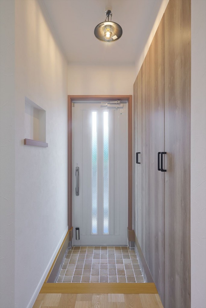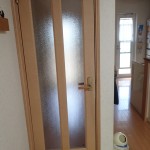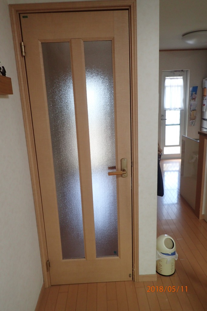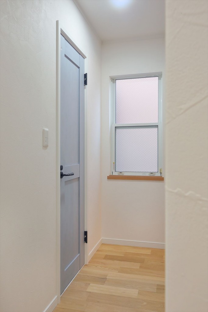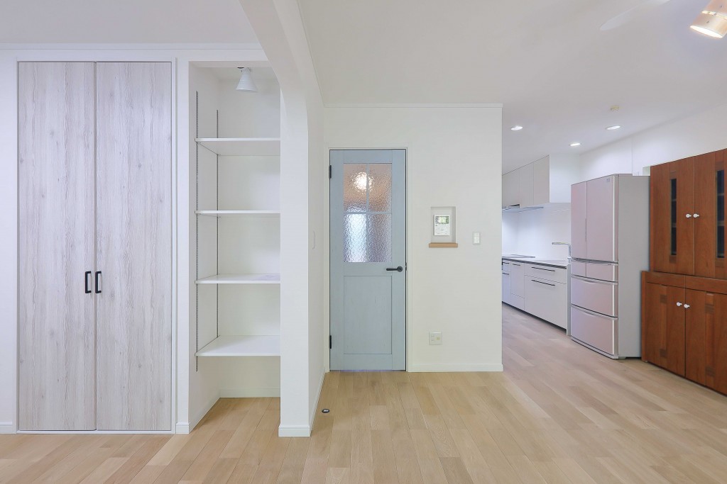 建具は、奥様がネットで見つけて一目ぼれした「リクシル・ラシッサDパレット」を採用。キッチンの入口にはチェッカーガラス入りのグリーンペイント、リビングの入口にはアンティークガラス入りのブルーペイントを選びました。
