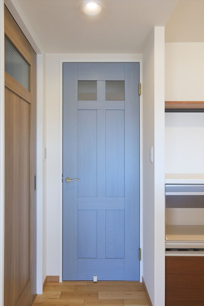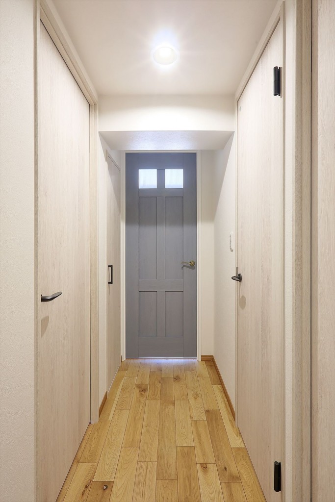 シンプルでナチュラルな北欧テイストの内装をセレクト。ポイントクロスや建具など、ヴィンテージ感あるデザインでアクセントを入れています。LDK入口の建具はPanasonicの『ベリティス クラフトレーベル』というワンランク上のシリーズ。