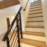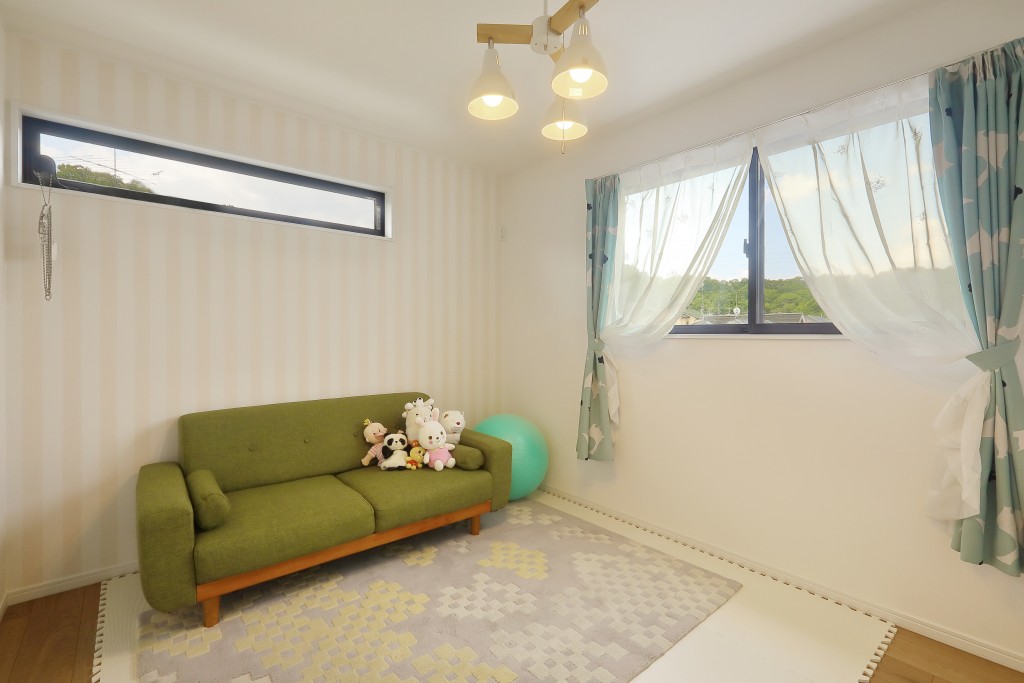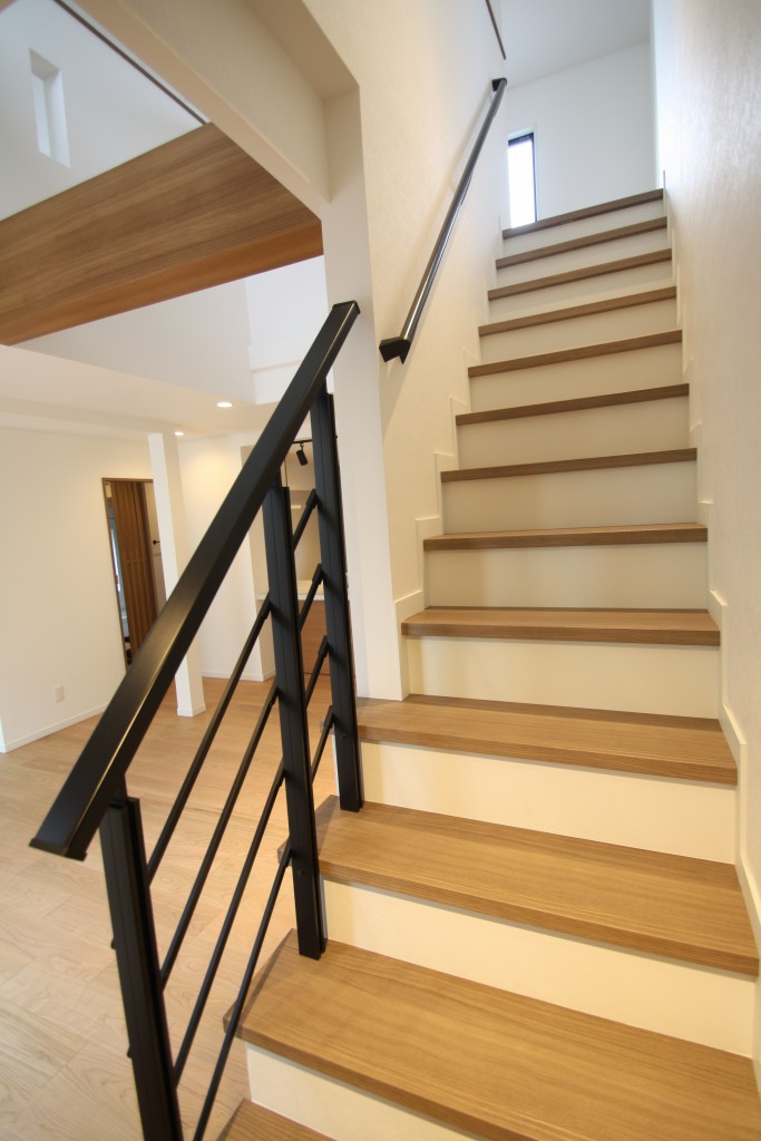 階段は向きを変え、リビングから入れる「リビングイン」に変更しました。4段目まではおしゃれなアイアン手摺りを取付け、解放感を出しました。また階段の1段目を踊り場にして、小上がりの畳コーナーへの出入り口にしました。