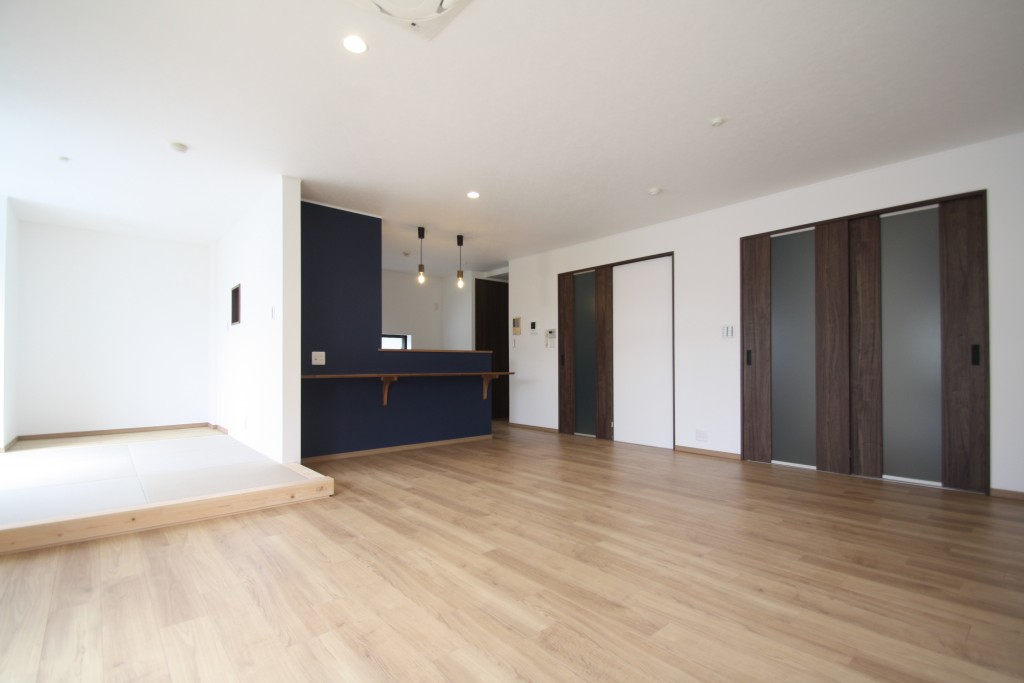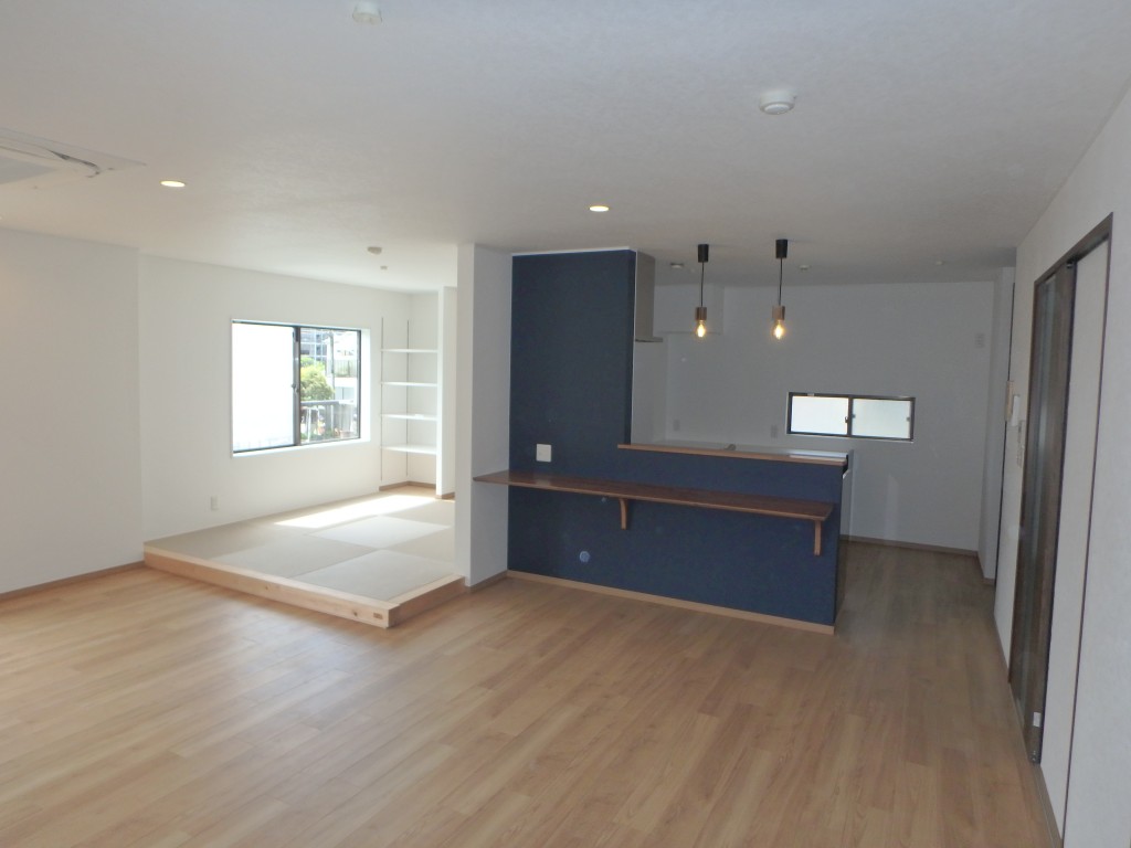 2階のLDKは大幅に間取りを変更しました。壁付けのキッチンは対面式に変更して、間仕切り壁を取り払い、オープンな空間にリニューアルしました。隣接する和室は4.5帖に縮小し、こちらもオープンな畳コーナーへと変更しました。稀に見る大空間です!