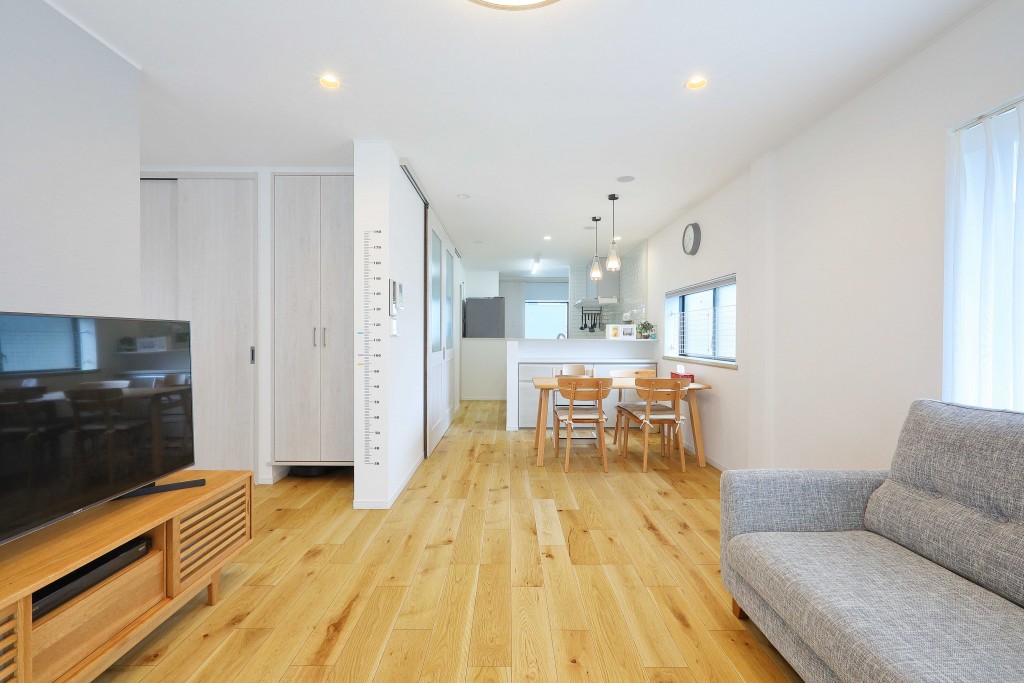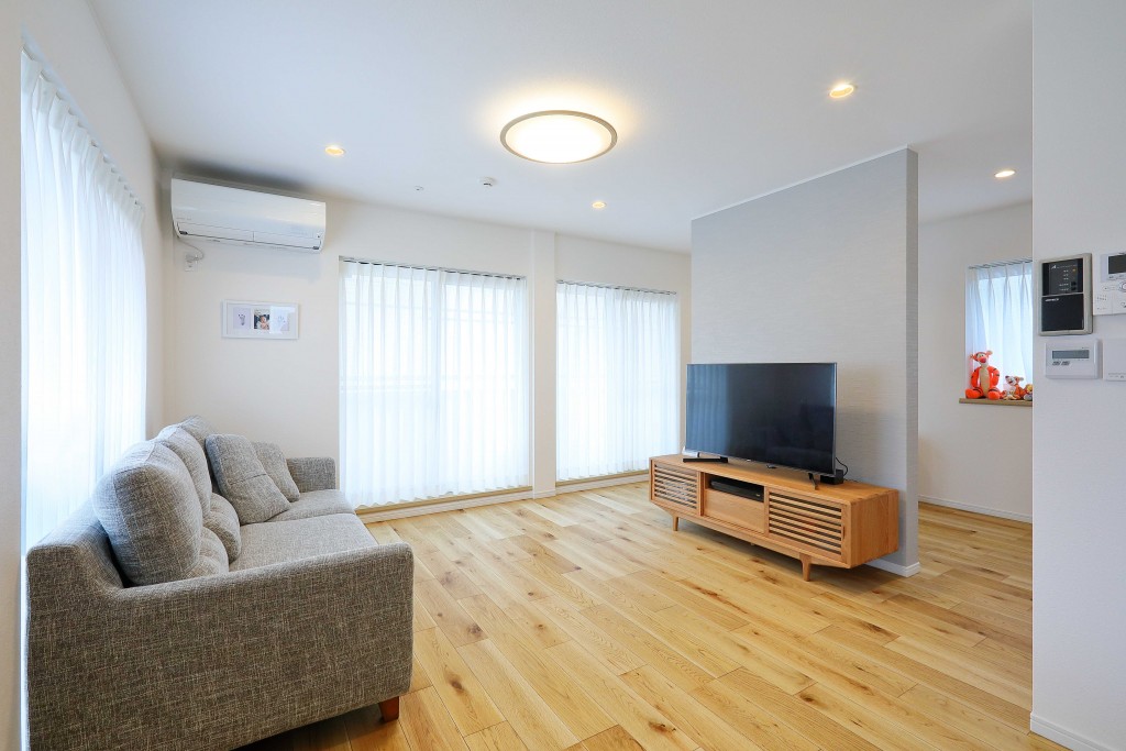 広々としたリビング中央の一部に壁を設けてテレビを置く場所を確保。リビング全体が一体空間でありながら、壁の裏側はプライバシーも守られるよう配慮されています。