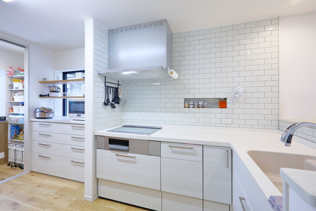 キッチンの正面の壁はタイルで仕上げ、調理中に手を伸ばしやすい位置には、ニッチを設けてスパイスラックとして便利に使えます。タイルのデザインや質感・目地の色まで大切に素材選びをして、おしゃれ感と清潔感が際立つキッチンに。