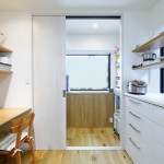 キッチンカウンターの高さをを少し高めに設定。ダイニング側の作り付け収納との間にスペースを確保し、ティッシュや携帯電話など日頃身近に置いておきたい小物の指定席として。