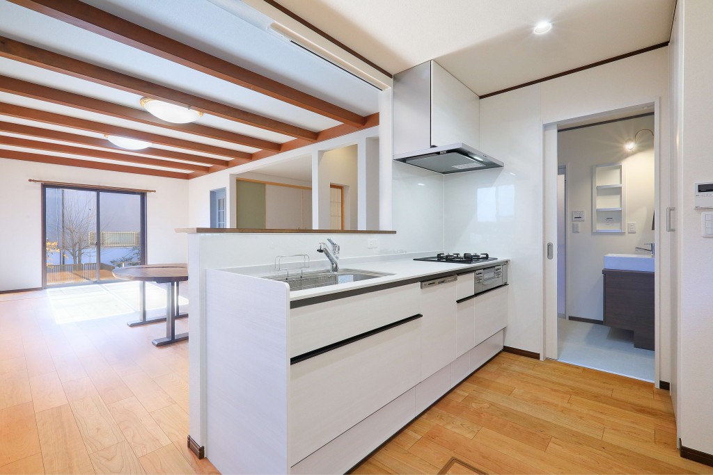 リフォーム前の面影はそのままに、キッチンを対面化して家事をしながらリビングの様子を見渡せるようにしました。リビング南側の床をタイル貼りにして、ご家族同様のワンちゃんが一緒に過ごせるようにしています。小上がりの和室はちょっと腰を掛けるのに丁度良い高さに。