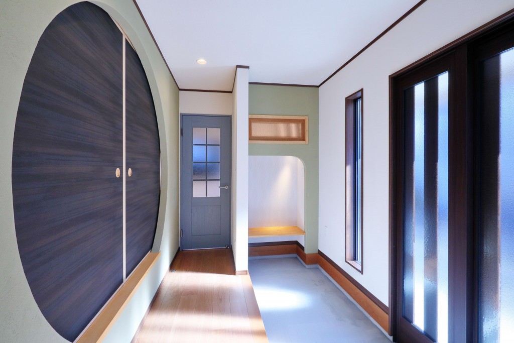 玄関の位置を大胆に変更し各部屋の繋がりを持たせることにより開放感のあるお住まいになりました。特に玄関のデザインにこだわり、帰ってきたご家族やお客様を出迎える素敵なスペースに。
