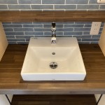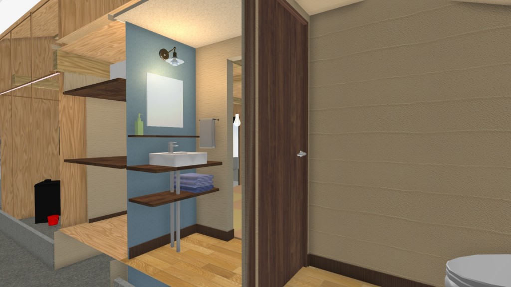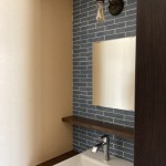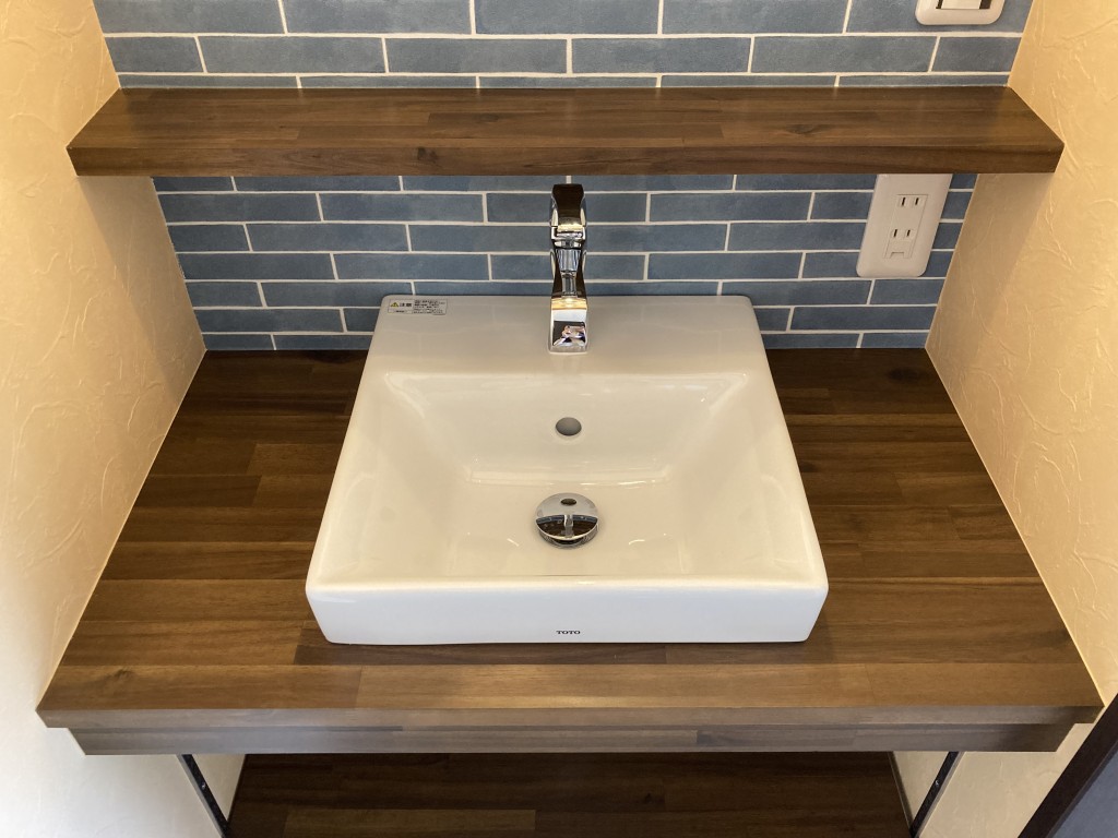 洗面台は既製品ではなく、カウンターやボウル・水栓をセレクトして造作洗面に。壁正面はタイル貼りに見えますがリアルなアクセントクロス仕様です。