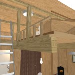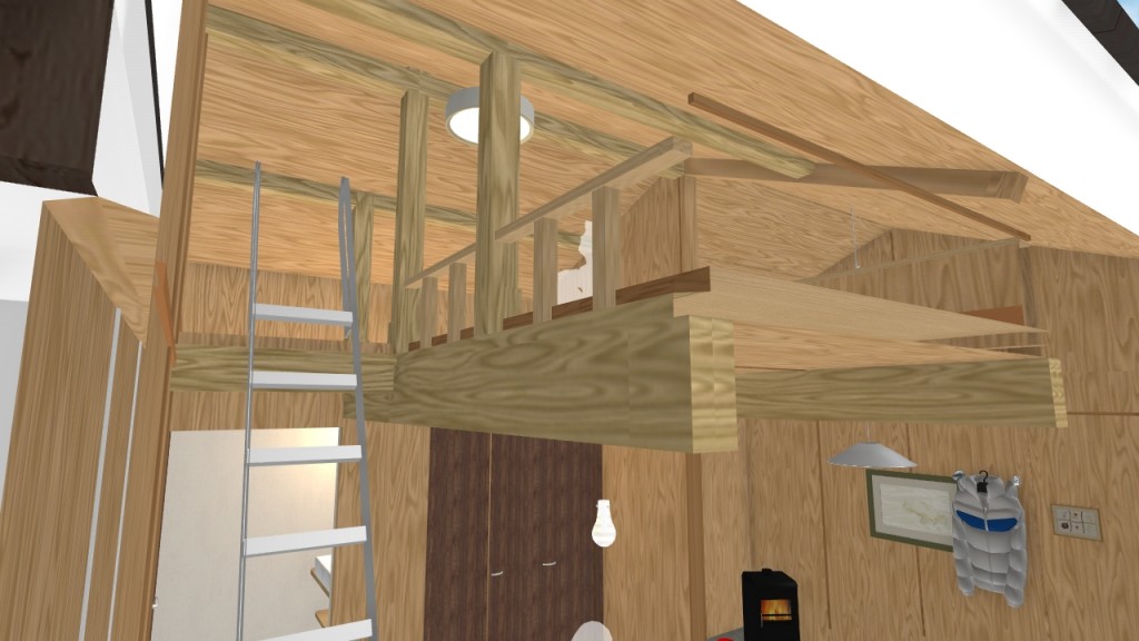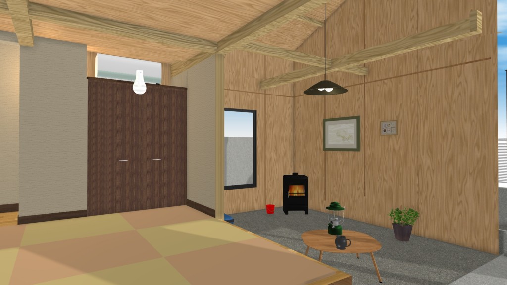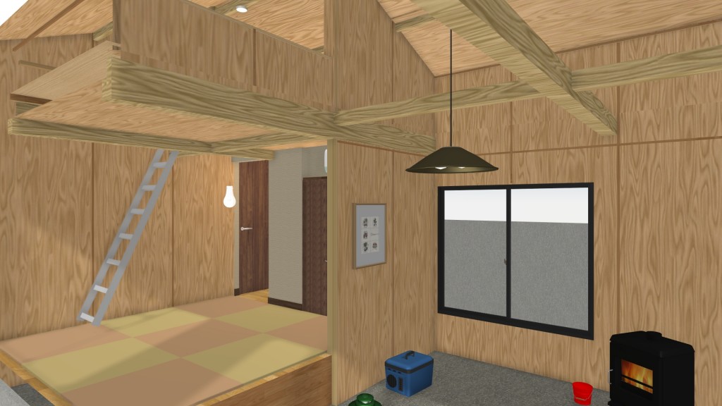 建物は平屋でとってもコンパクト。ロフトを新設して空間を最大限に広げる工夫を。天井は屋根なりに、内装は統一してラーチ合板仕上げ。まるで山小屋のような雰囲気に。