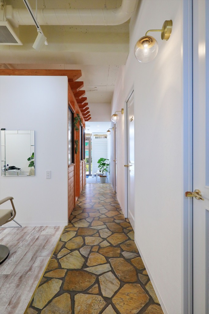アイラッシュエリアは、流木や波・潮風を感じさせる、海岸沿いのカフェのような空間に。パーゴラを設置して空間の木視率を40%前後に設定し、「ワクワク・楽しい」と「落ち着く雰囲気」を両立。