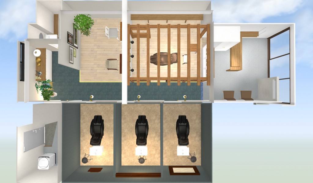 以前にA様ご夫婦が勤めていた店舗での体験やお客様からのお声を参考に、来店するお客様が何度も足を運びたくなるリラクゼーション空間、そして働くスタッフの方々が楽しく仕事ができる空間を目指し、何度も打合せを繰り返して一緒にお店を作り上げました。