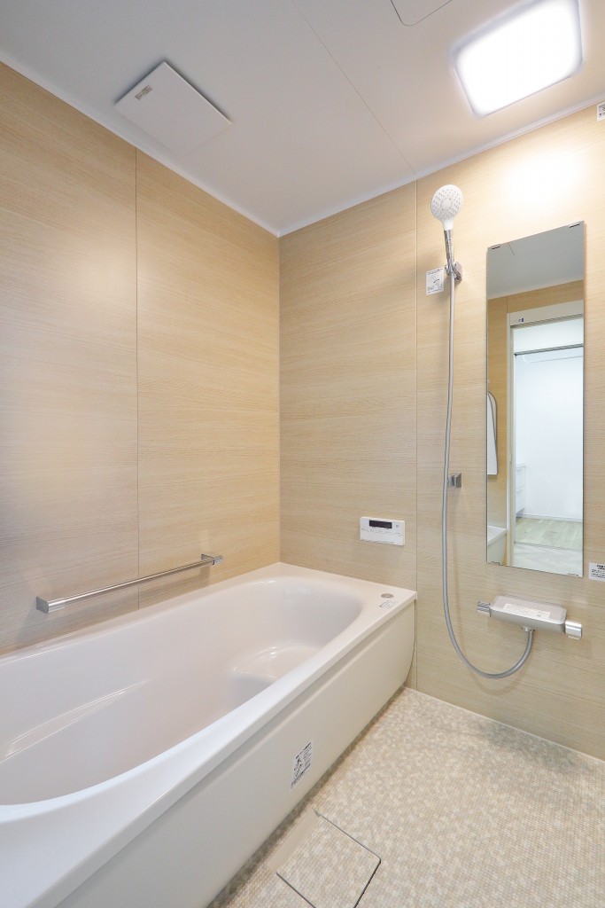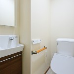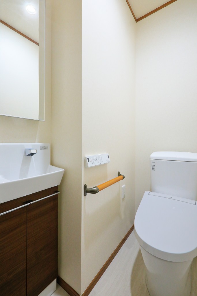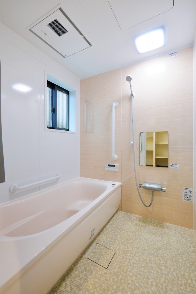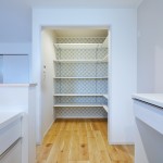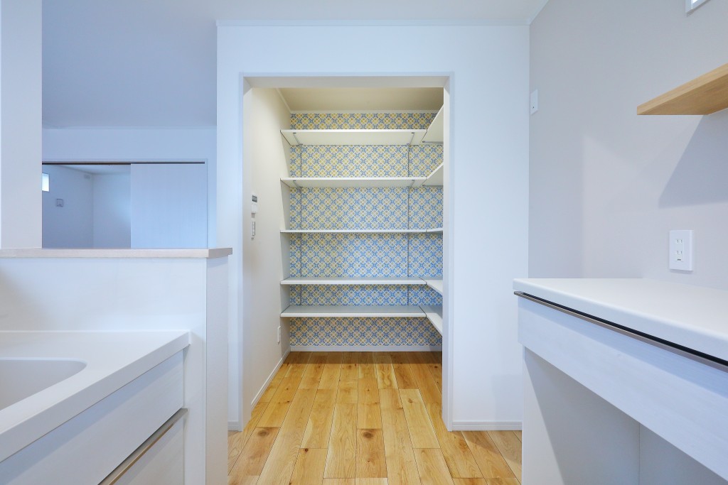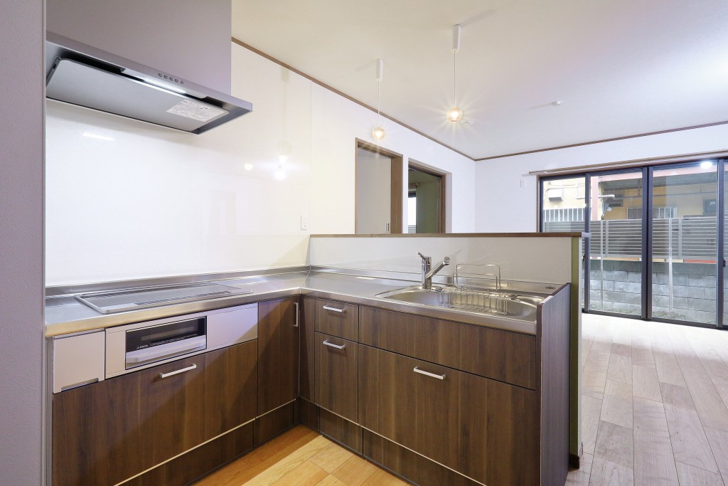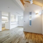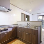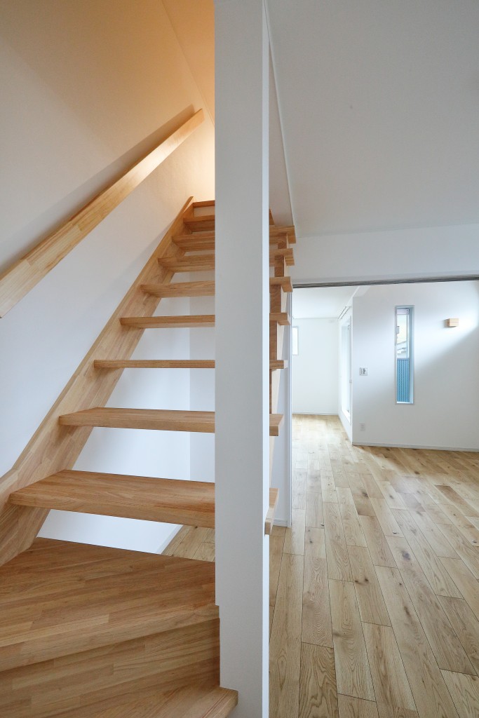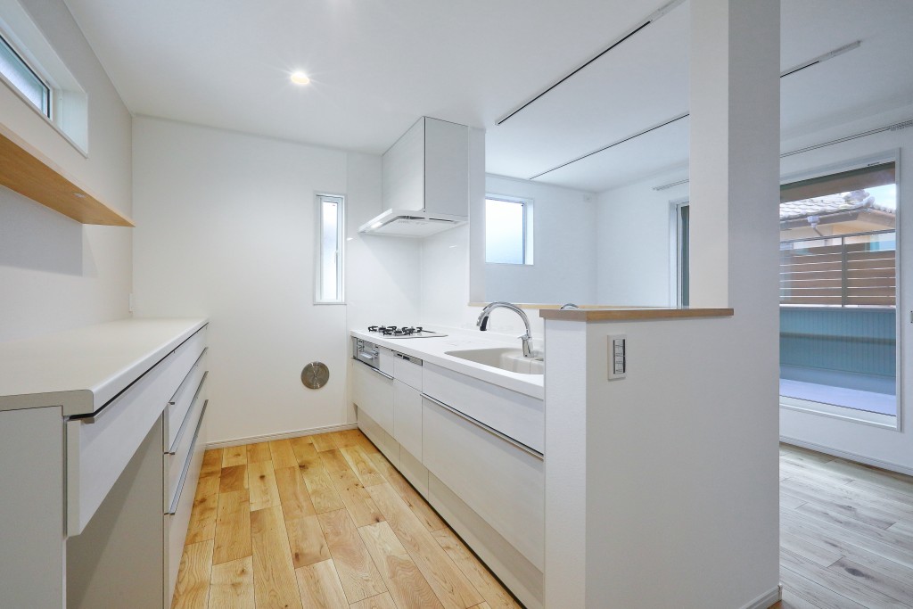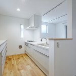 1階はご両親の居住スペースになるので、床段差の解消・リビング床暖房・浴室暖房・手摺りの設置等ご高齢者の暮らしに配慮させて頂きました。キッチンは1階がL型・2階はI型ですが、どちらも対面式に配置し、お子様に目が届くよう工夫しています。