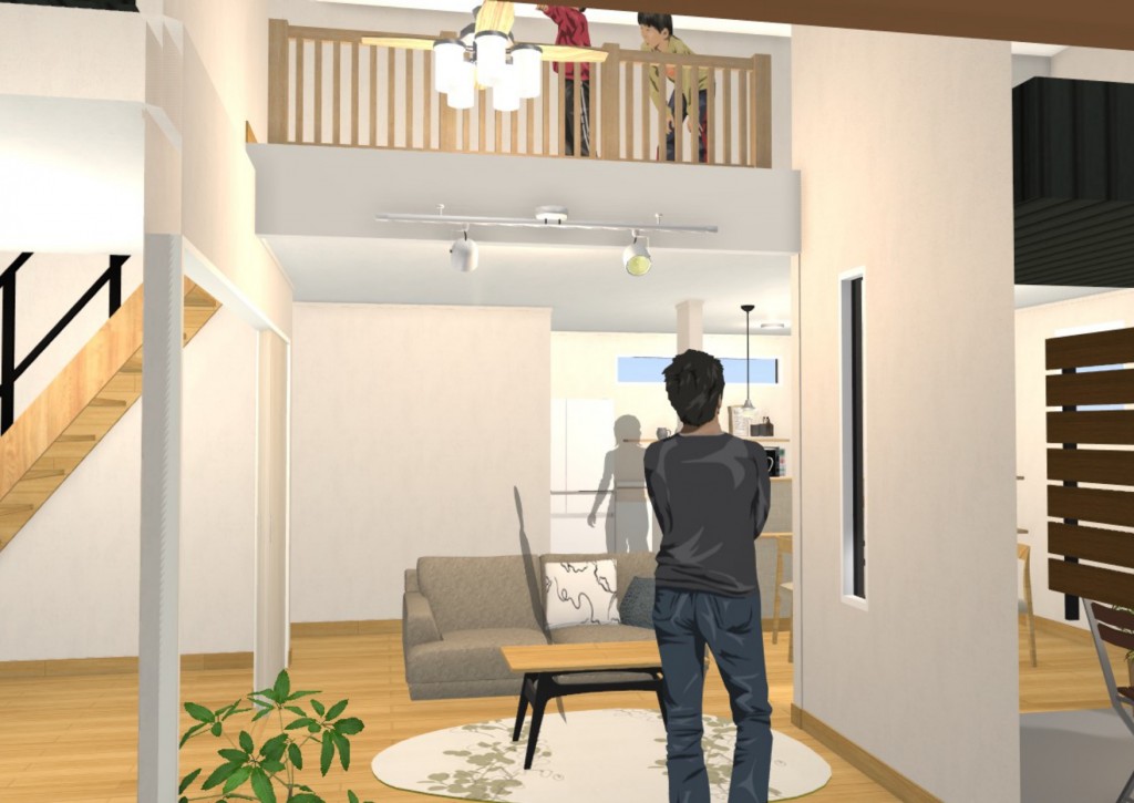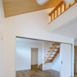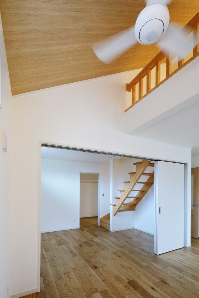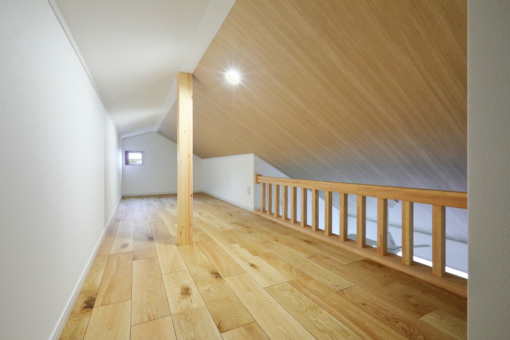 2階リビングの天井を屋根なりに上げ、約6帖分の広いロフトスペースを設けました。リビングと空間がつながっているので、ロフトに居ても気配を感じる事ができます。2人の男の子が大喜びの隠れ家的空間になりました。