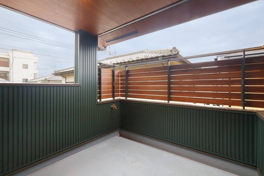 2階にはリビングから出入りできるインナーバルコニーを設置しました。約4.5帖の広さがある屋根付きバルコニーです。雨の日でも洗濯物を干す事ができ、夏の夜にはビアガーデンにもなるセカンドリビング的な空間です。外壁にはオシャレなガルバリウム鋼板のサイディングを貼っています。
