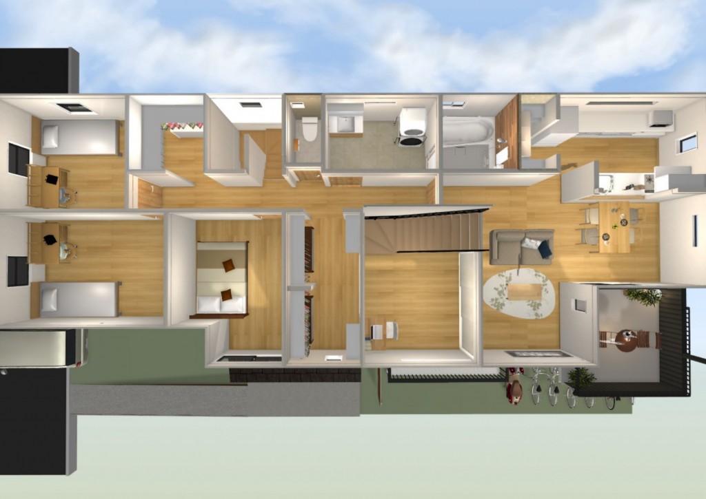 1階に親世帯、2階に子世帯という完全分離型の二世帯住宅プランをご提案させて頂きました。それぞれに玄関・キッチン・浴室・洗面室・トイレがあり、お互いに気兼ねなく生活できるよう配慮させて頂きました。