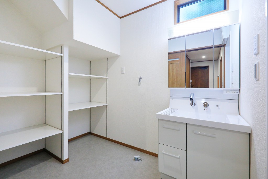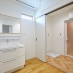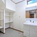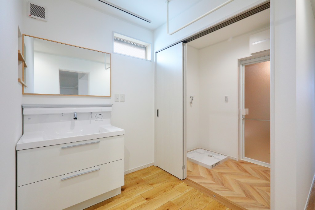 延床面積が202㎡と広いので、水廻りスペースはなるべくゆったりと確保しました。1階の洗面所は階段下を利用して約3帖、2階の洗面所は洗面スペースと脱衣スペースを分け、3.5帖の広さを確保しています。
