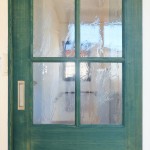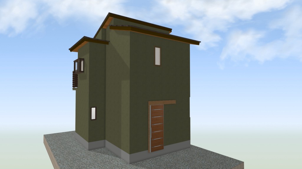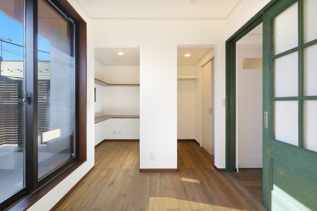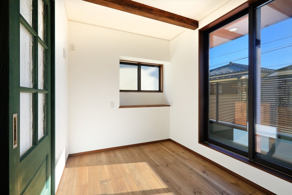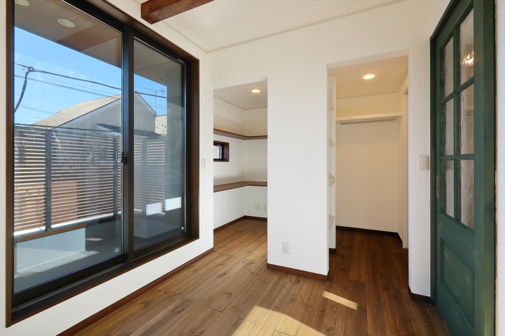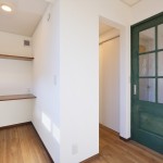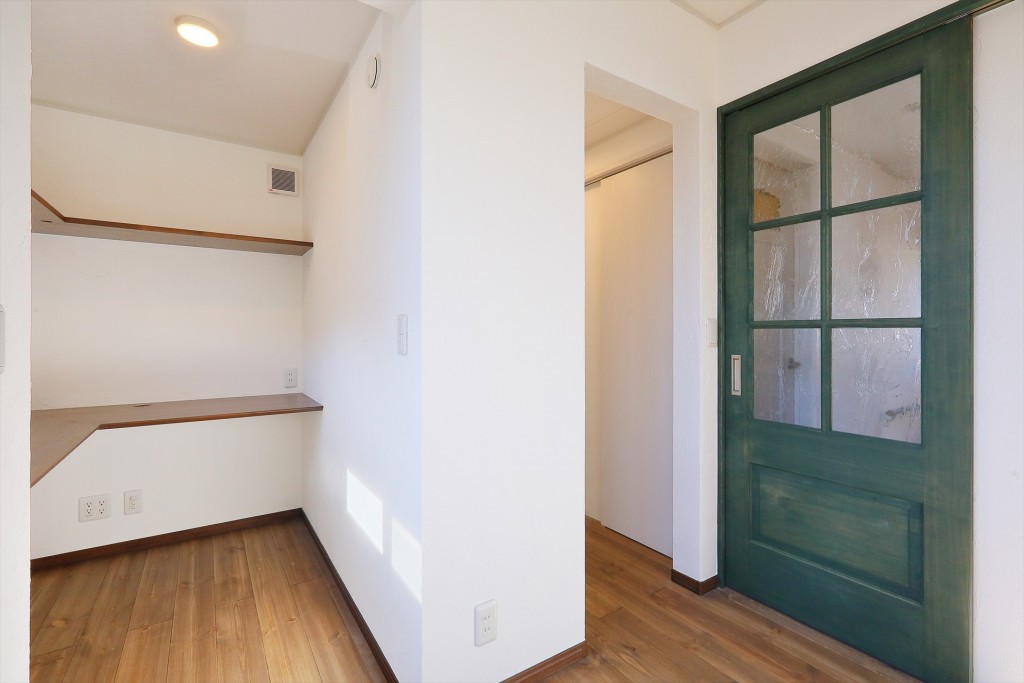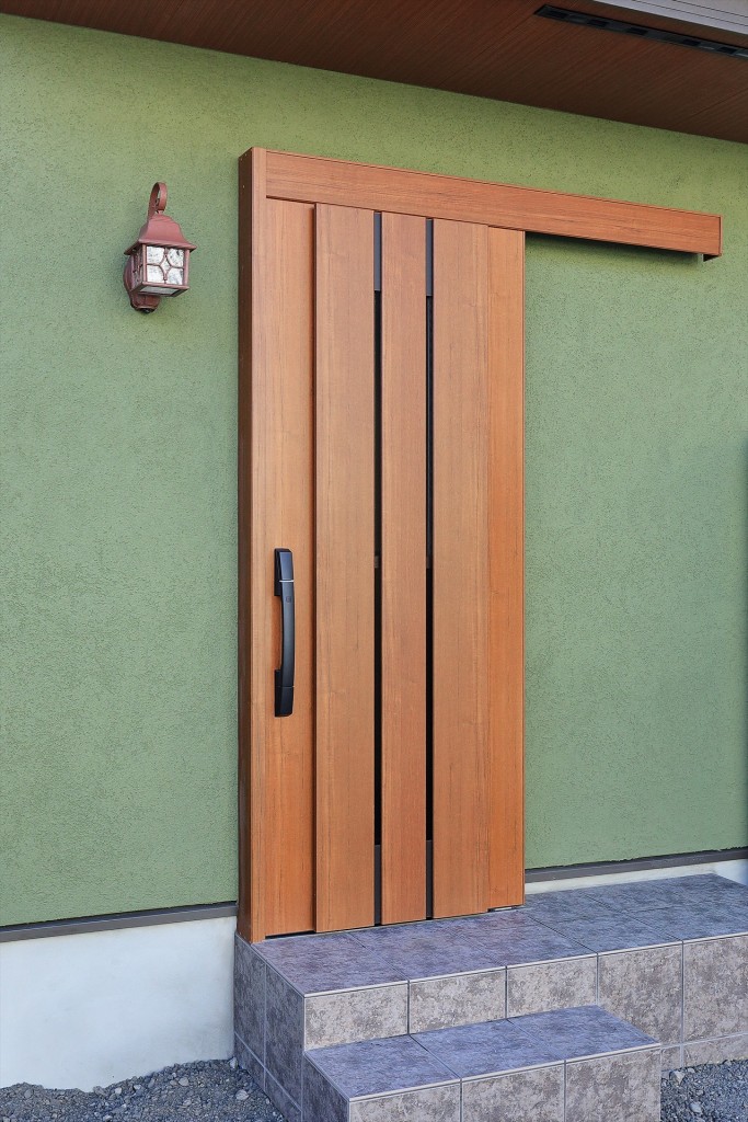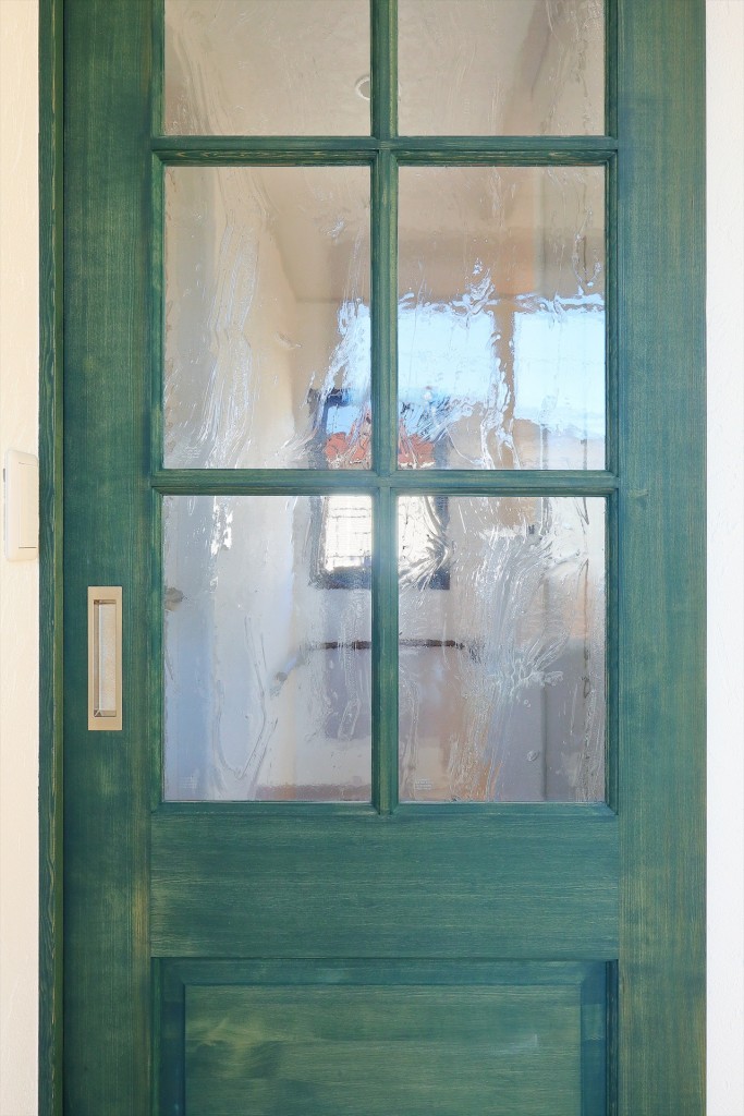 2階寝室の入口には無垢の扉を採用。テーマカラーの「緑色」の扉は、私のお気に入りです。外壁は、環境にやさしい塗り壁材『ディパネート』の「深緑」を選んで左官屋さんに塗ってもらいました。