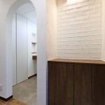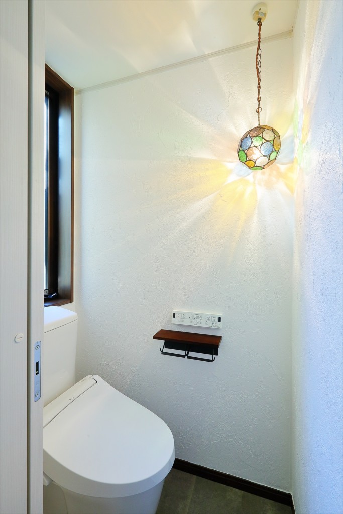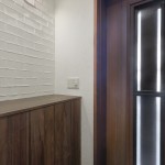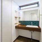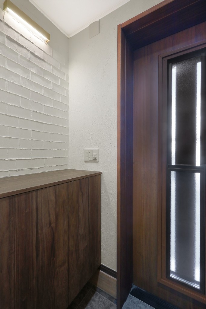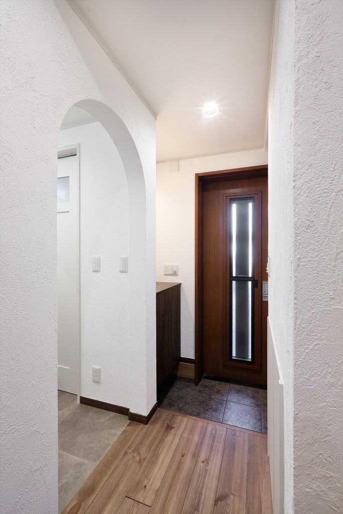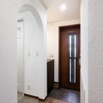 玄関のシューズボックスの上は、“好きなもの”を飾れるディスプレイスペースにしました。壁面は漆喰の塗りパターンを“レンガ調”に仕上げ、照明を当てました。洗面スペース入口のアール型開口も私の好きなデザインです♪