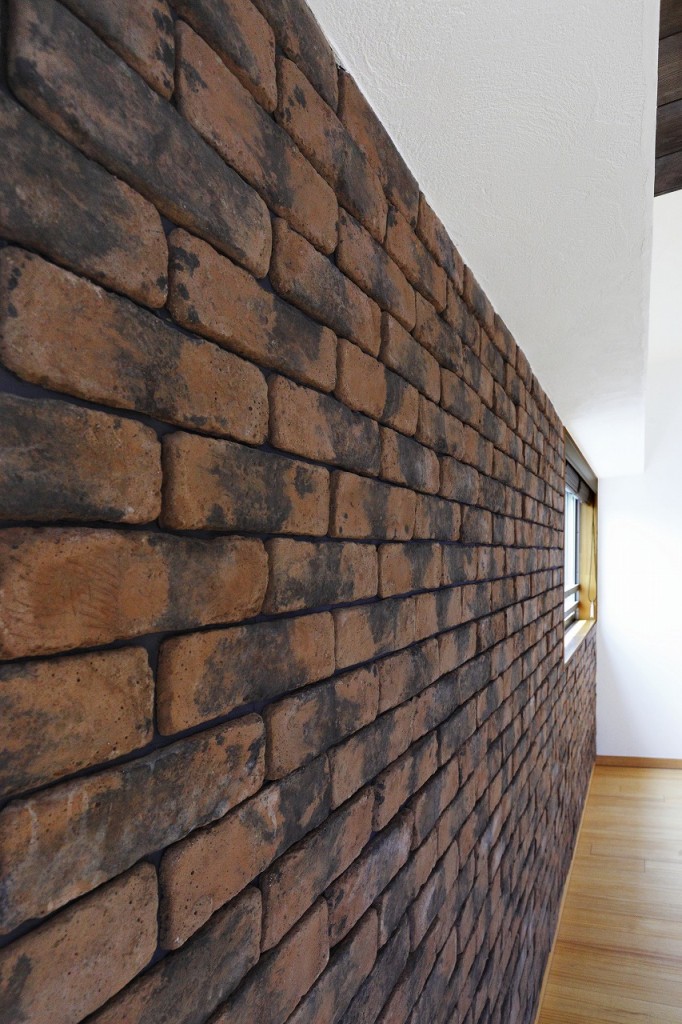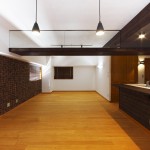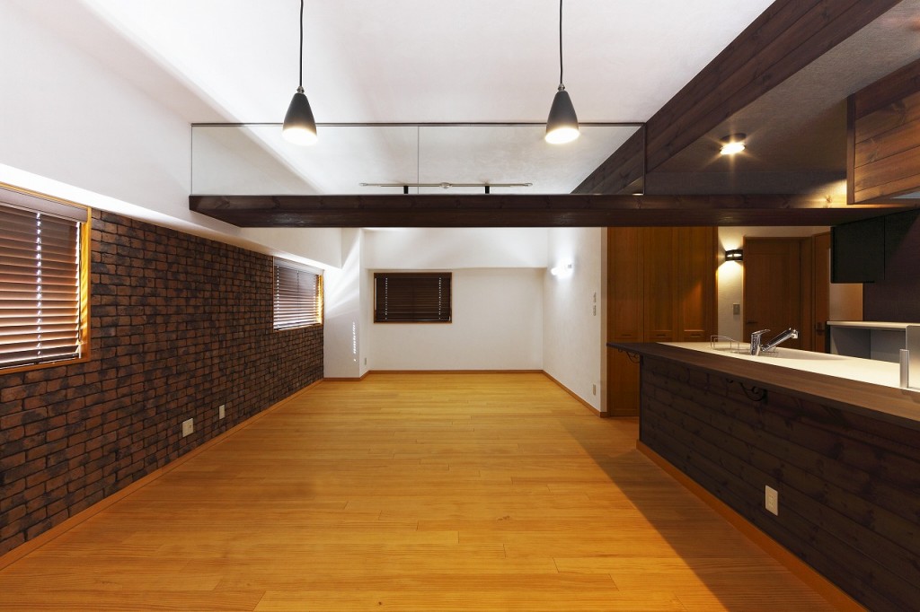 LDKの南側の壁一面には本物のブリックタイルを貼って重厚感を演出。天井にある大きな梁の存在感が悩みの一つでしたが、鏡を貼ることによって存在感を軽減させました。