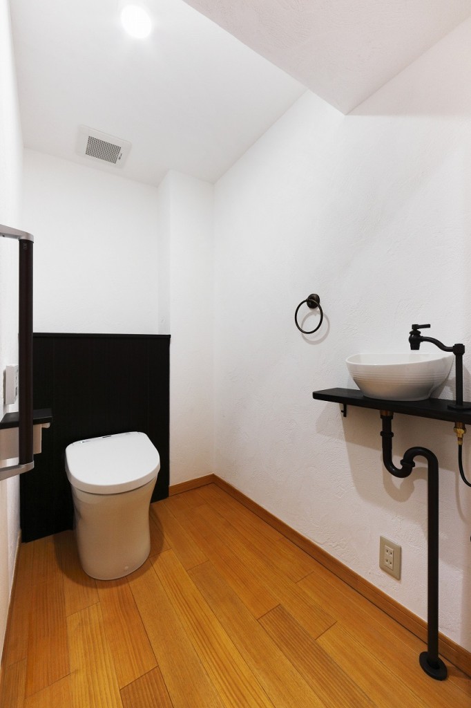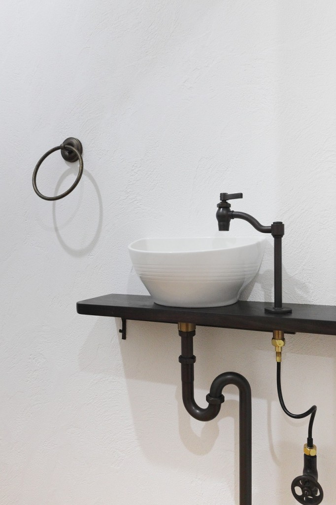 洗面台は、完全オリジナルの造作です。広いカウンターは水廻りに安心な耐水性カウンターを採用。壁にはスイスしっくいを塗って仕上げています。スイスしっくいは、カビに強いので水廻りにもおすすめの優れた素材。