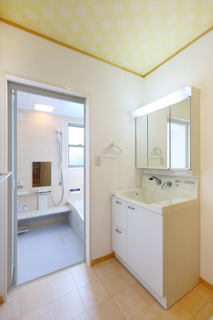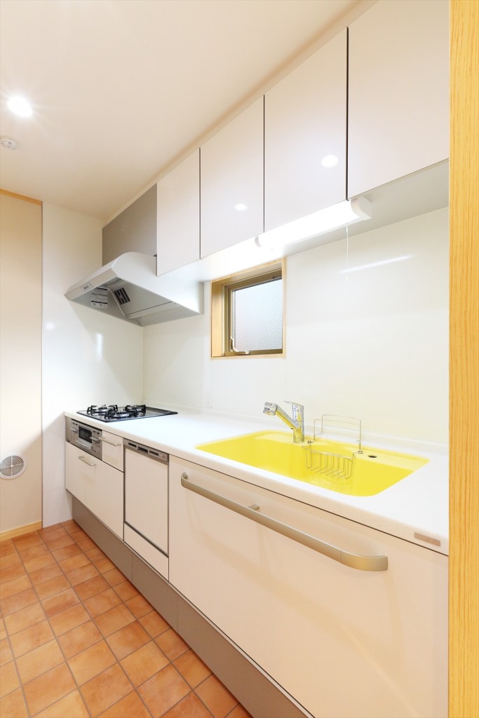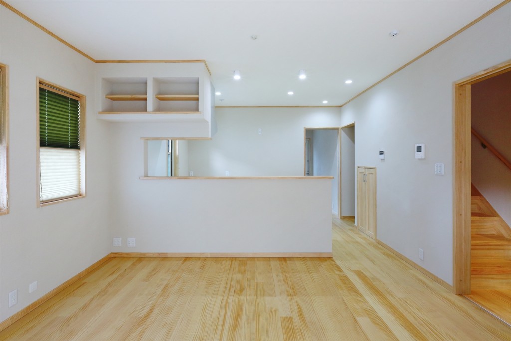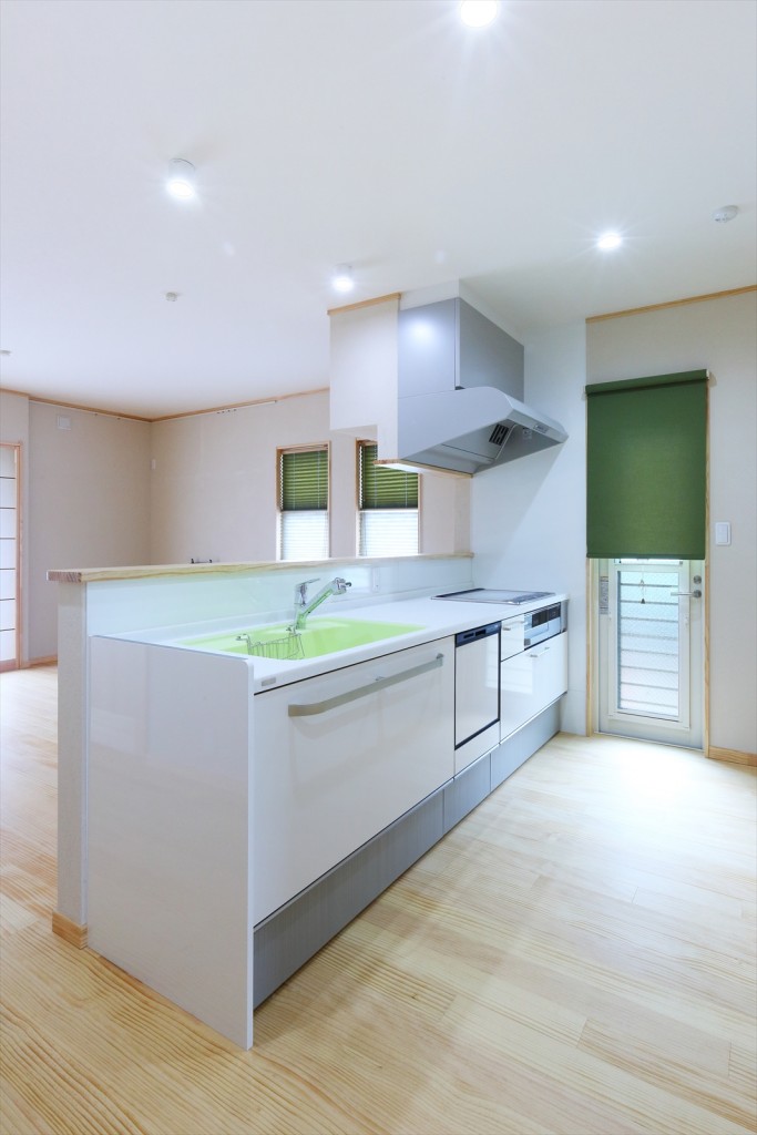 1階(親世帯)のLDKは、家族と会話が弾む対面式キッチンへ変更(TOCLAS/BbシリーズI型)。床や建具は明るい無垢のパインで統一し、壁は調湿効果がある珪藻土で仕上げています。
