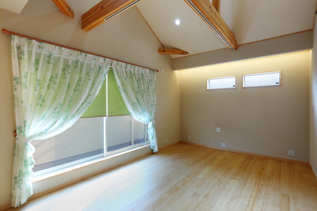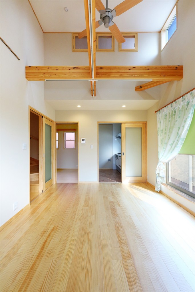 2階(子世帯)LDKは、天井を吹き抜けにした開放的なリビングです。梁をダイナミックに魅せた、木のぬくもりを感じられる心地のよい空間。